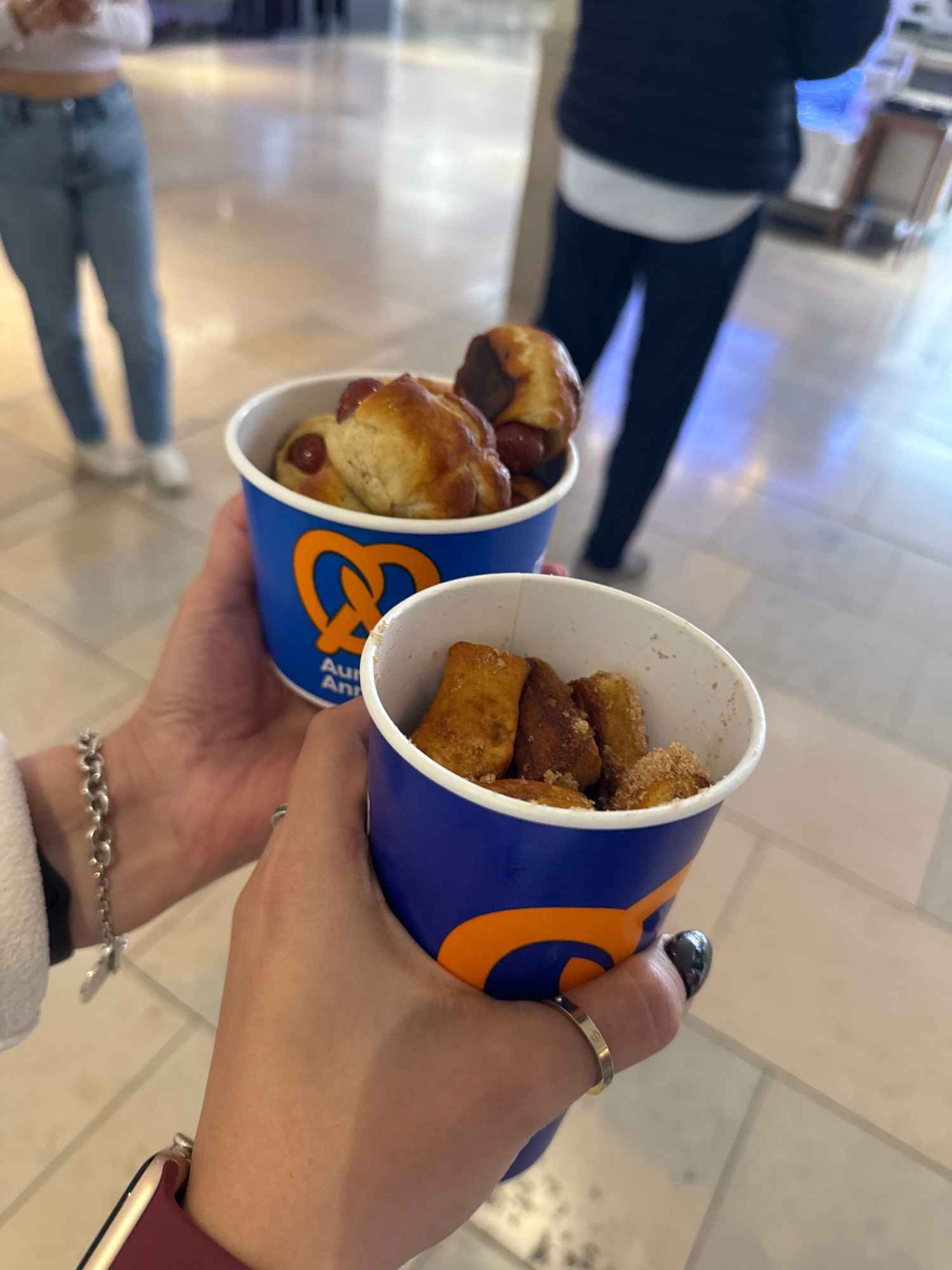 A first-person view presents two cups of Auntie Anne's food being held indoors in an open area. The cup on the left contains pretzel dogs, while the cup on the right contains pretzel bites. The person…read more