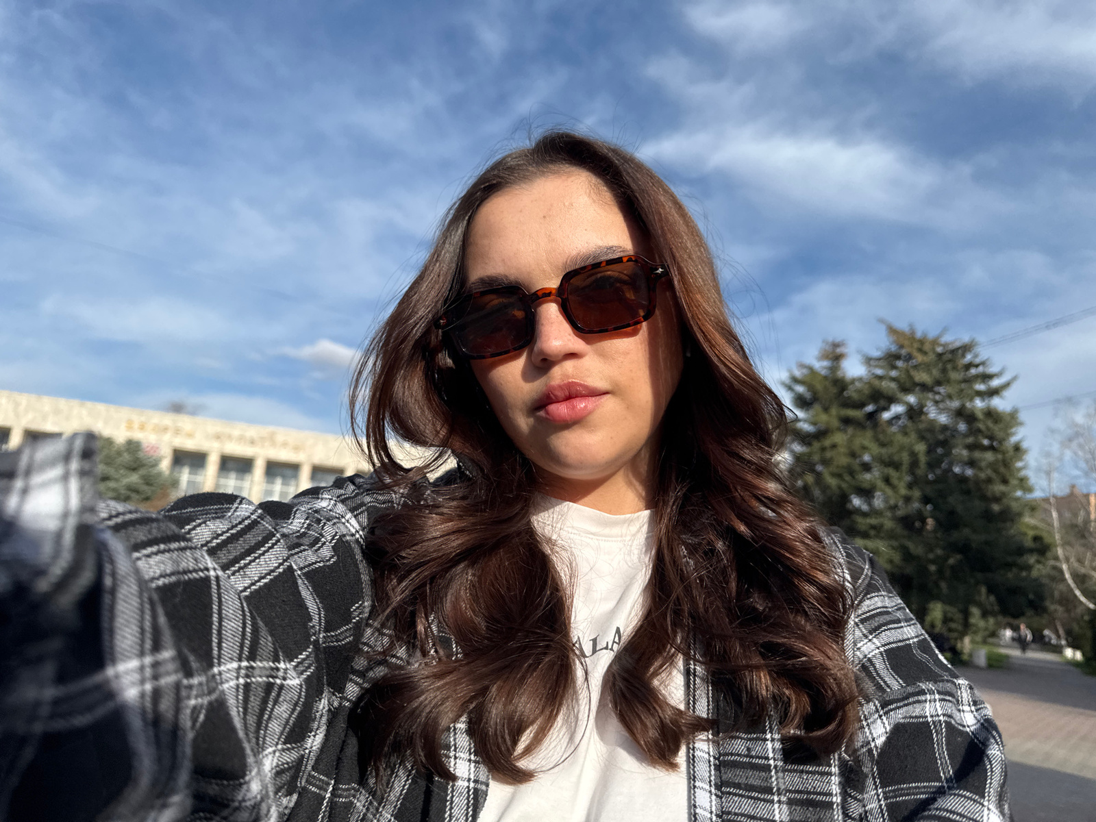 A selfie of a woman with brown hair wearing sunglasses and a black and white plaid shirt over a white t-shirt. The background shows a blue sky with clouds, a tree, and a building with windows. The bui…read more