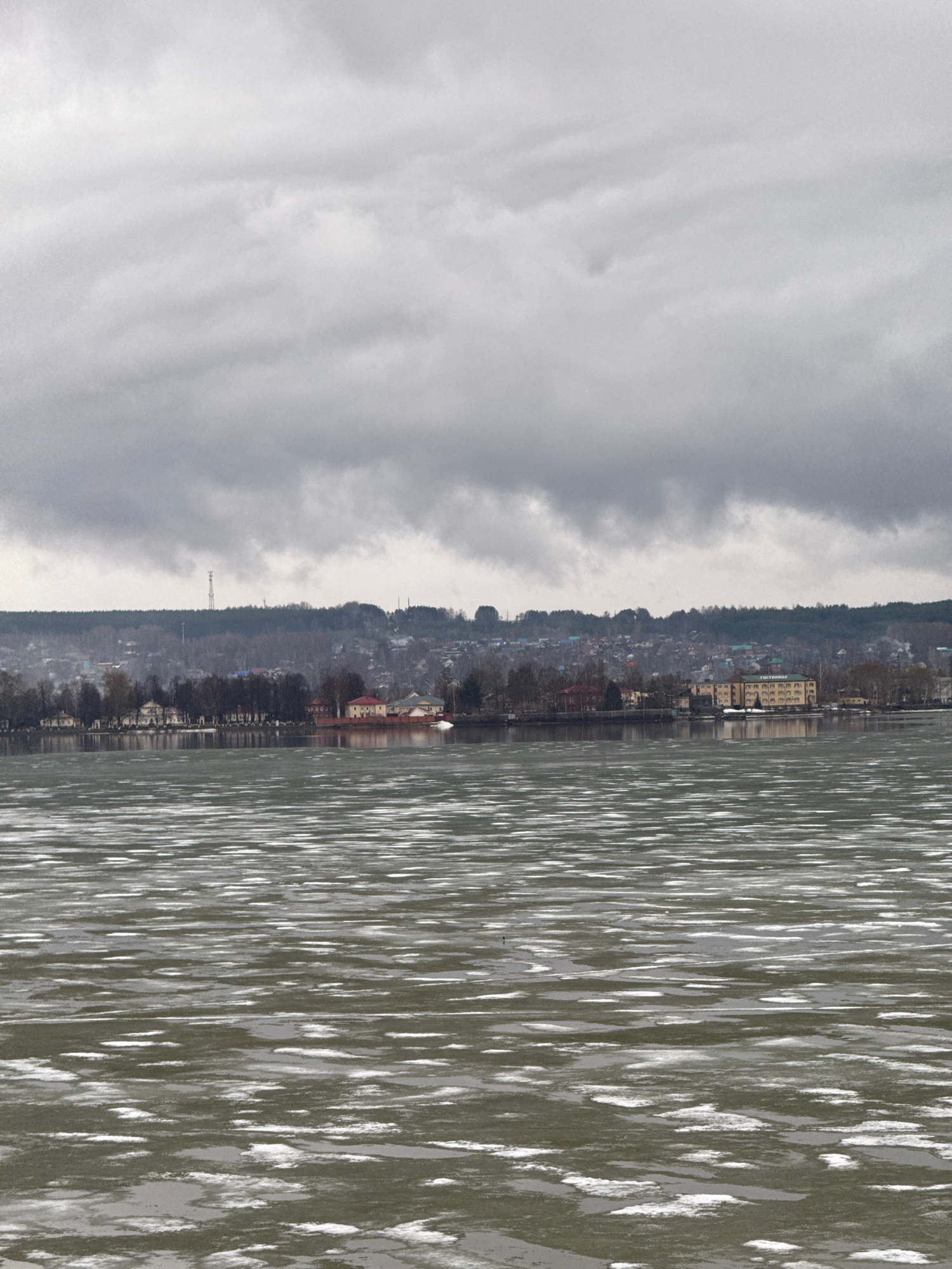 The image captures a water body, likely a reservoir or river, adjacent to a shoreline dotted with buildings and a line of trees, possibly within or near the city of Votkinsk, Russia. The sky is overcaβ¦read more