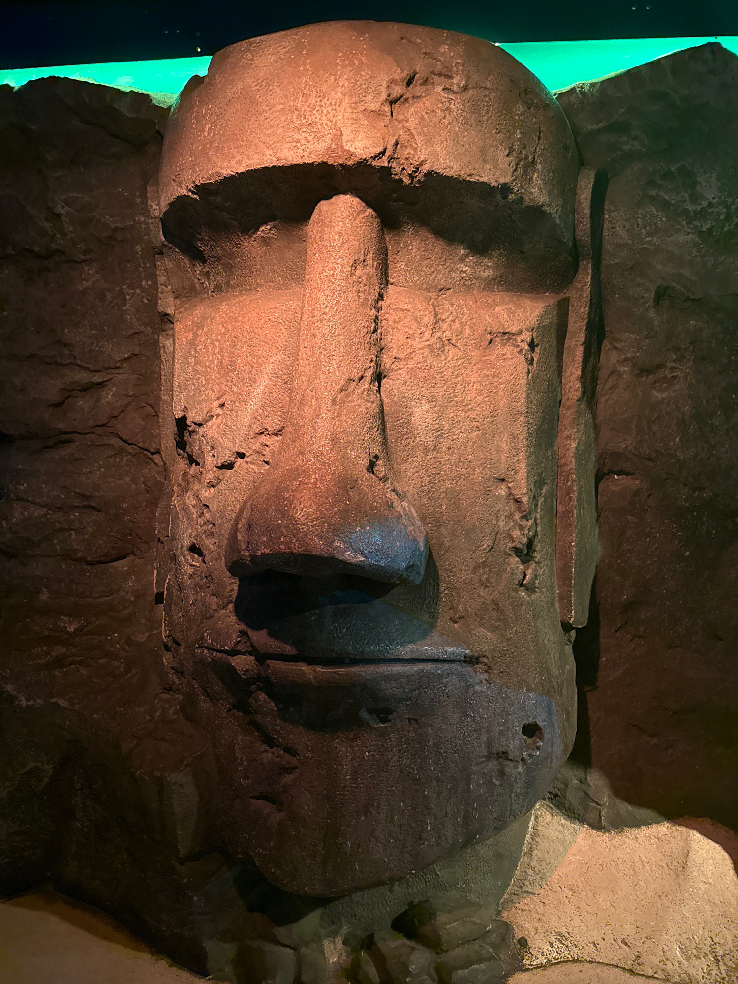 The image shows a monumental sculpted head, possibly of Ramesses II, resting on a dark, uneven stone base. The head, rendered in dark-brown stone, is depicted in profile. Details include a prominent n…read more