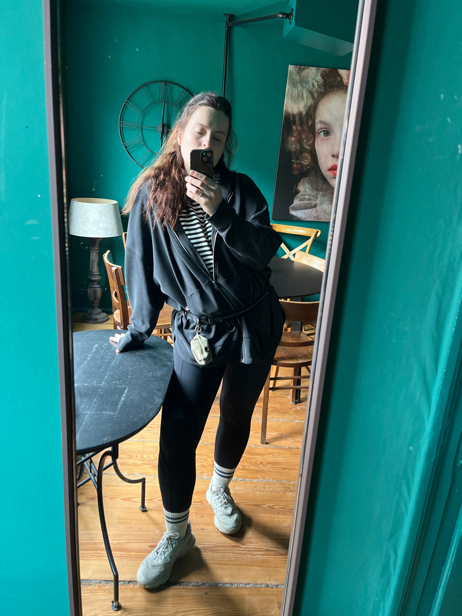 A woman is taking a mirror selfie in a room in Meisenheim, Germany. She is wearing black leggings and a black jacket over a black and white striped shirt, along with sneakers and socks with stripes. Sā¦read more