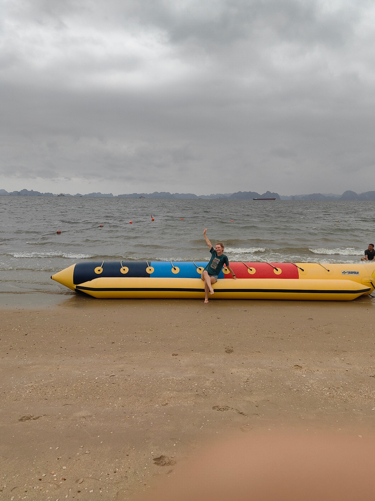 A woman is sitting on a yellow, blue, and red banana boat on a beach in Bai Chay Ward, Vietnam. She is waving her right hand up. There is a dark sky with some islands in the background, and the waves…read more
