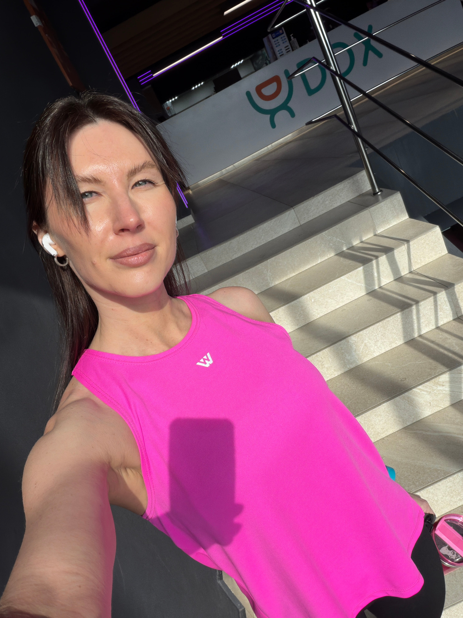 A woman with light skin, brown hair, and blue eyes is shown in a selfie. She wears a pink sleeveless top with a white logo on the left side of the chest and wireless earbuds in her left ear. Her face…read more