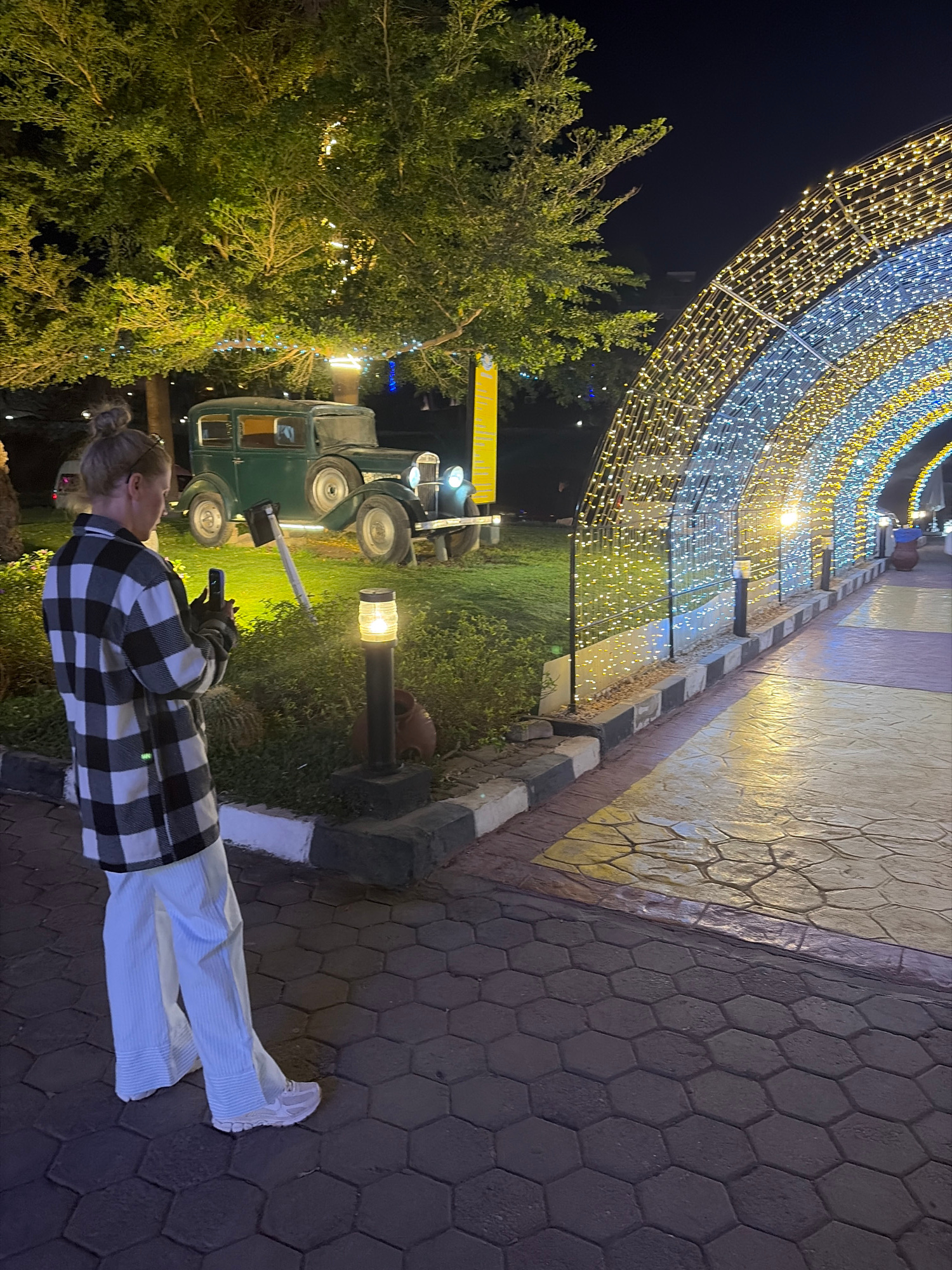 A full shot captures a woman standing on a dark gray, hexagon-paved walkway, holding a phone or camera on a selfie stick. She is wearing white shoes, light blue corduroy pants, and a black and white p…read more