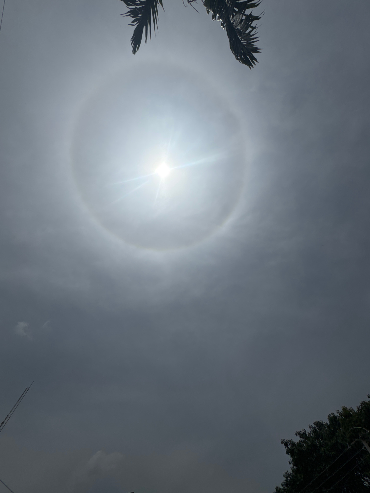 The image shows a solar halo, a ring of light around the sun. The sun is in the center of the halo, with bright rays emanating from it. The sky is overcast with gray clouds. In the lower left corner,…read more