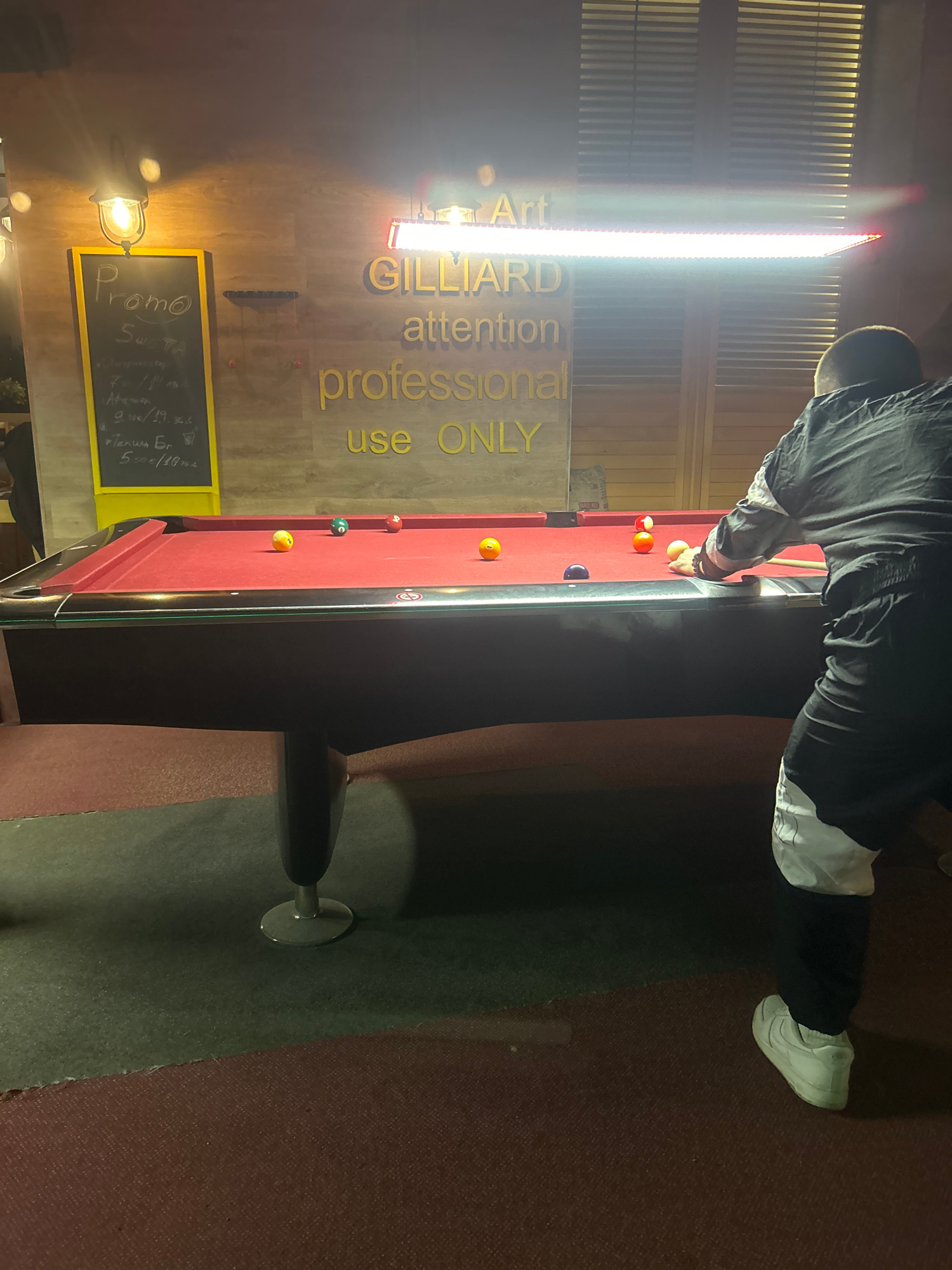 The image captures a scene inside what appears to be a billiards hall, likely in Veliko Tarnovo, Bulgaria. A pool table with a red felt surface takes up the central space. Several billiard balls are s…read more