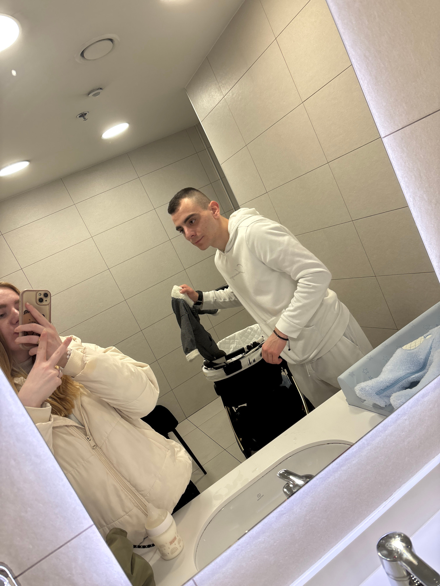 The image appears to be a reflection in a bathroom mirror. In the reflection, a man and a woman are visible. The man is wearing a white tracksuit and is facing the mirror. The woman is wearing a light…read more