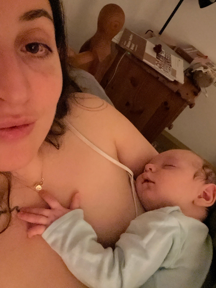 A close-up captures a woman lying down, gazing at the camera. A baby, wearing a long-sleeved shirt, sleeps peacefully nestled on her chest. The woman has dark hair and a necklace with a heart-shaped c…read more