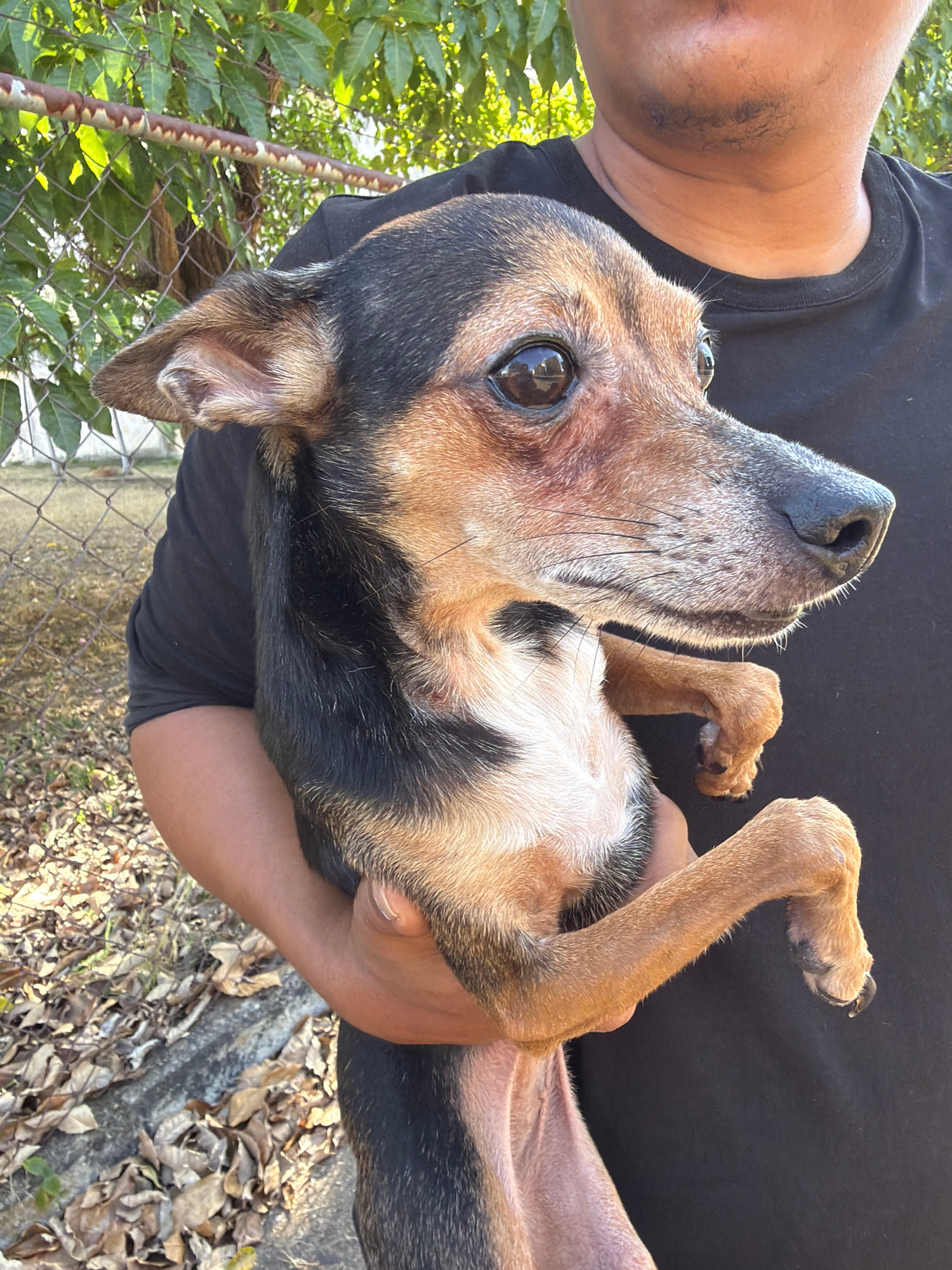 A brown and black dog is held in a person's arms. The person is wearing a black T-shirt. The dog is upside down, looking up at the camera. The dog's belly is white. The background is a chain-link fenc…read more
