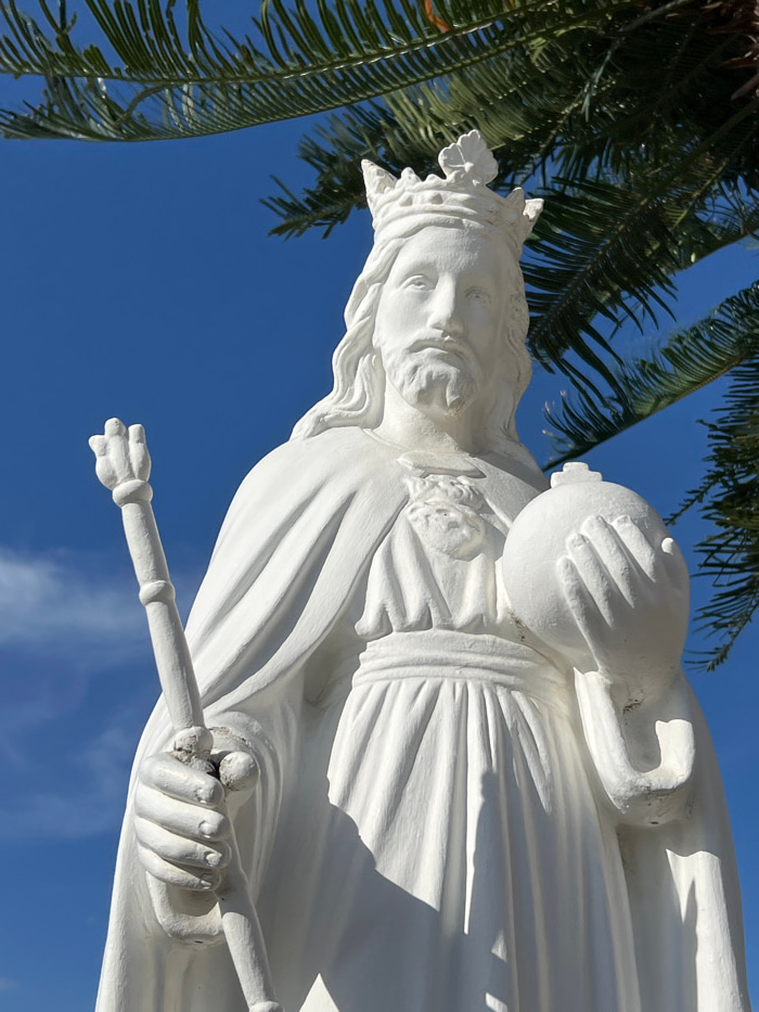 A white statue of a male figure, identifiable as Christ the King, is depicted against a clear blue sky, partially obscured by dark green palm fronds in the upper right and top center. The statue, like…read more