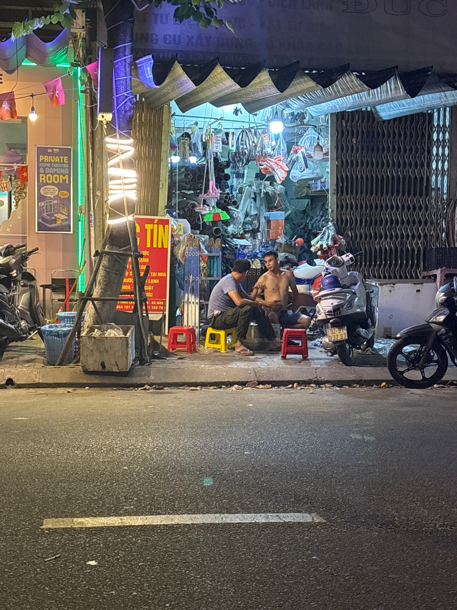 The image depicts a street scene at night in Đà Nẵng, Vietnam. A partially shirtless man sits on a red stool while another man, wearing a blue shirt, appears to be massaging his feet. They are positio…read more