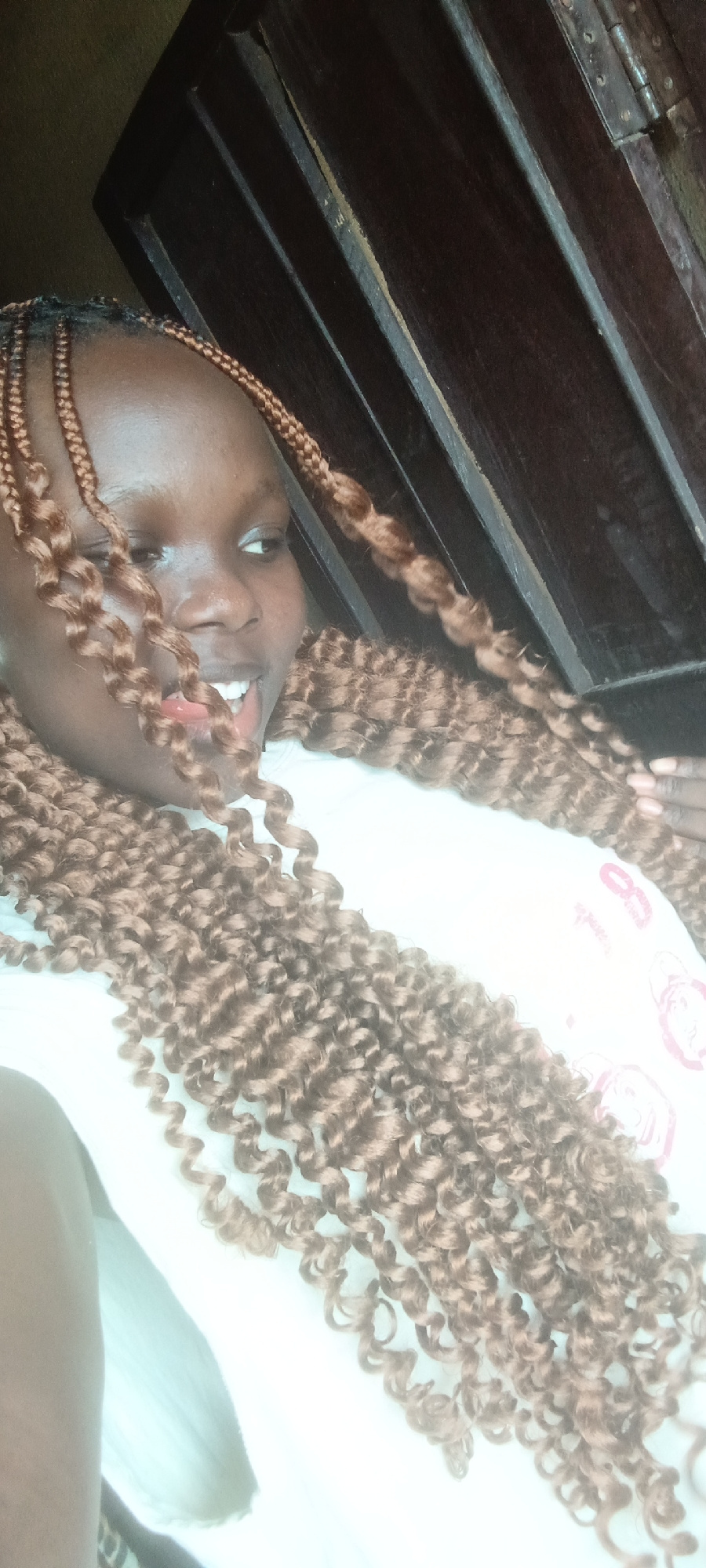 A vibrant portrait captures a young woman, likely in Onitsha, Nigeria, against a dark wooden background. She has dark skin and is adorned with long, voluminous, light brown, curly braided hair, which…read more