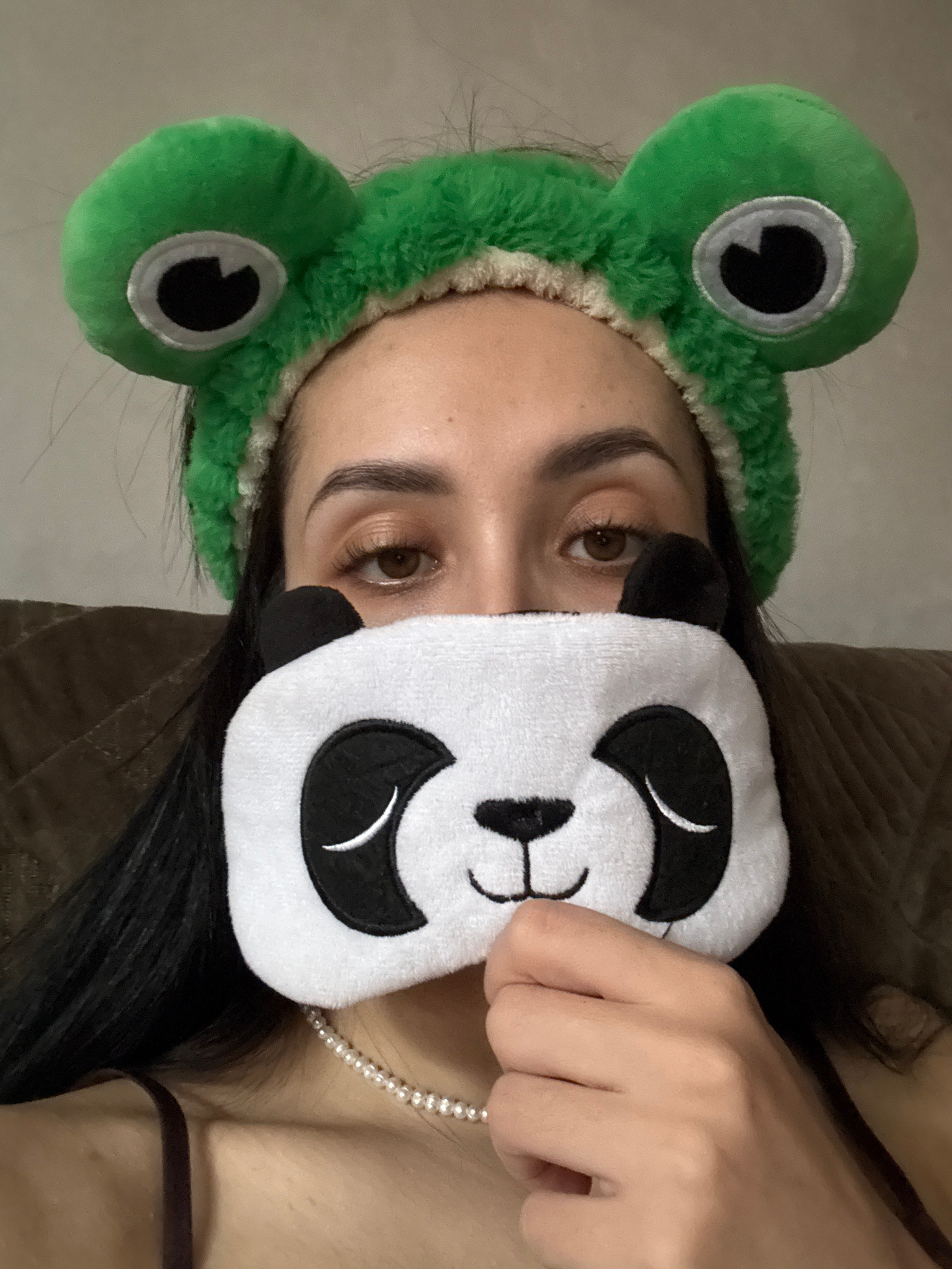 An indoor, horizontally oriented close-up shot features a person, likely female, with dark hair and brown eyes. The person wears a bright green, plush headband designed to resemble a frog, complete wi…read more