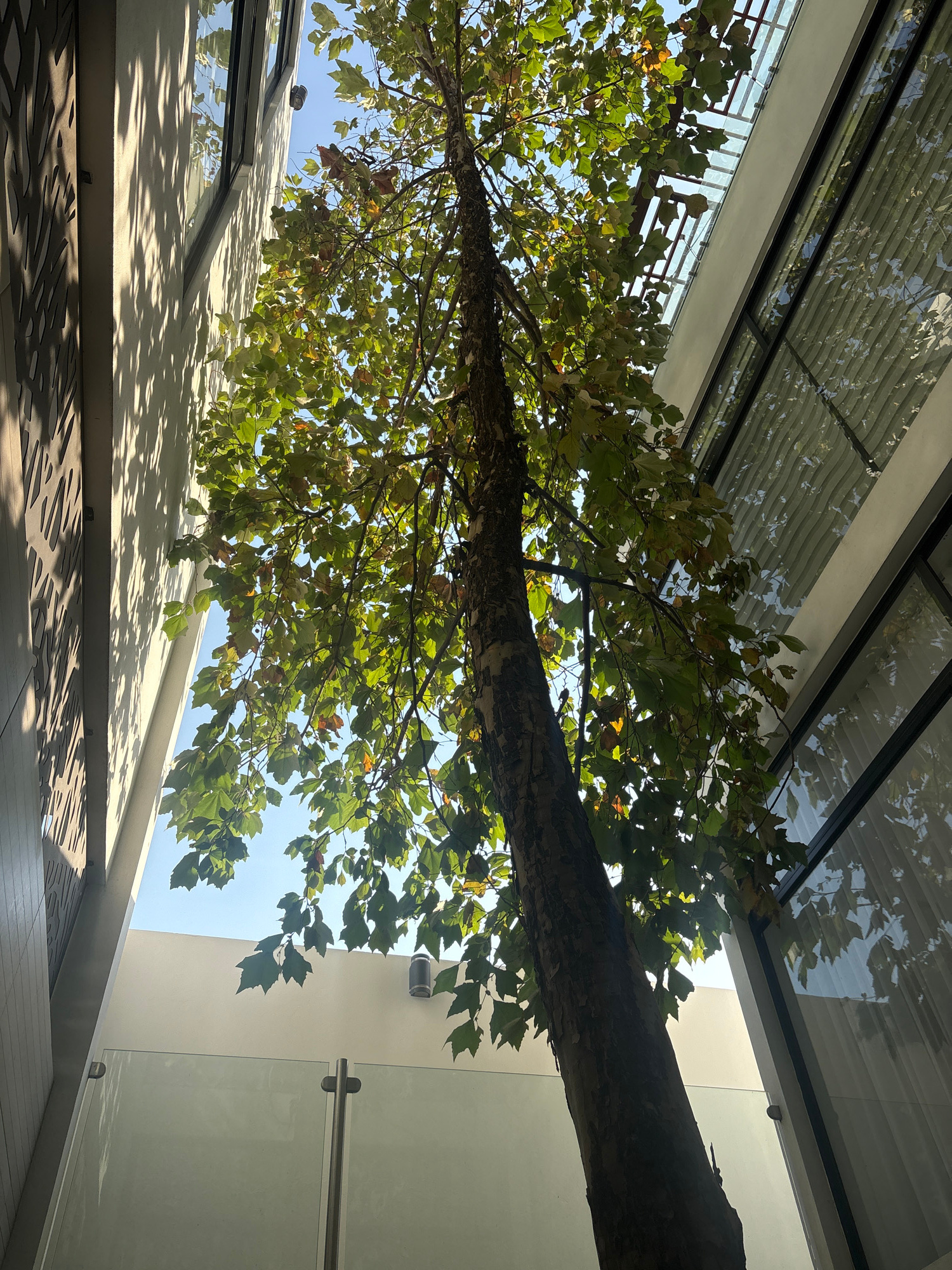 The photograph captures an upward perspective of a tree extending through an architectural space, suggestive of an inner courtyard or lightwell in San Bernardino Tlaxcalancingo, Mexico. The tree's sub…read more