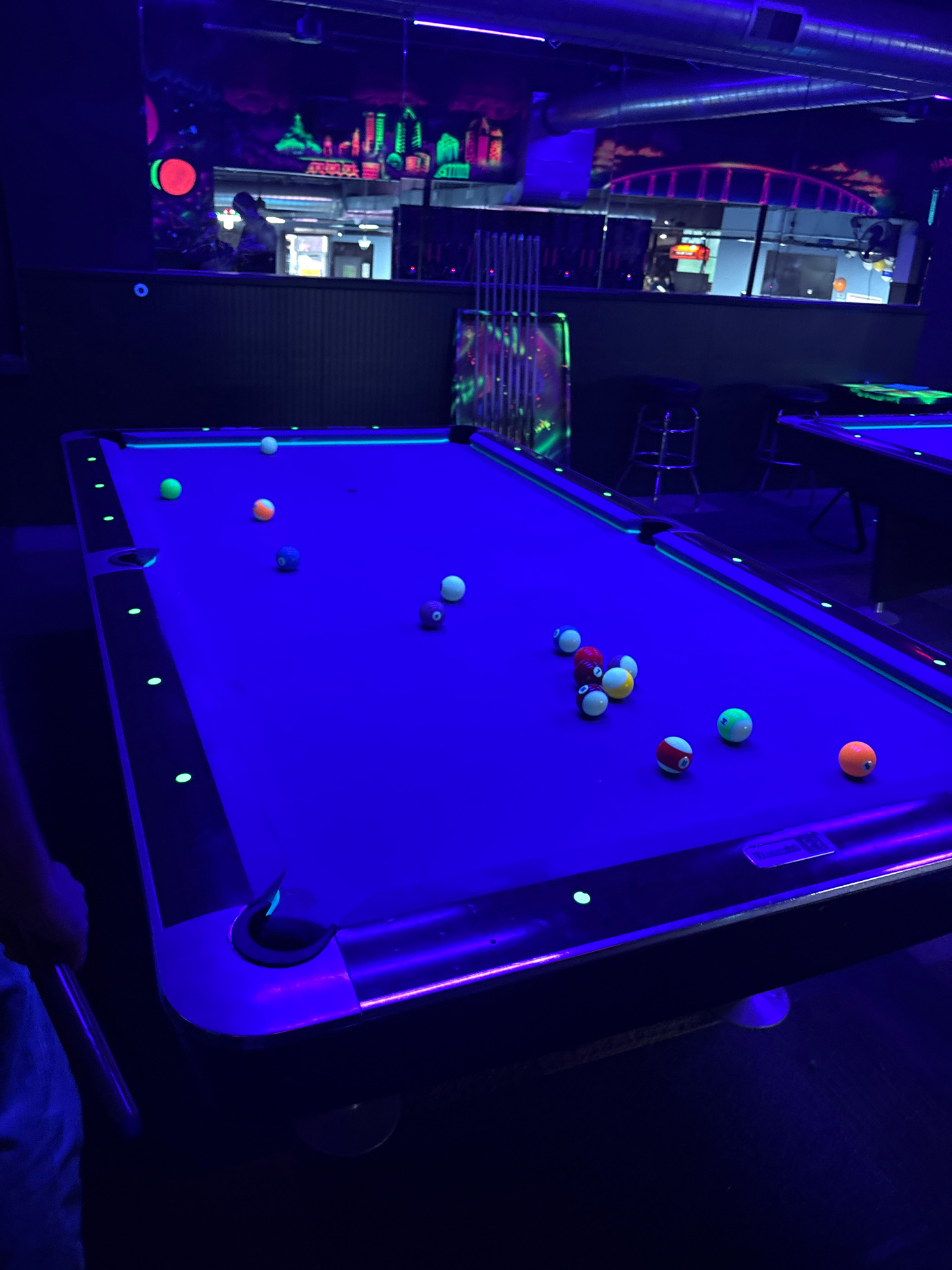 The image depicts a pool table under blue fluorescent light with pool balls scattered across its surface. A pool cue is visible in the lower right corner. The setting appears to be an indoor entertain…read more