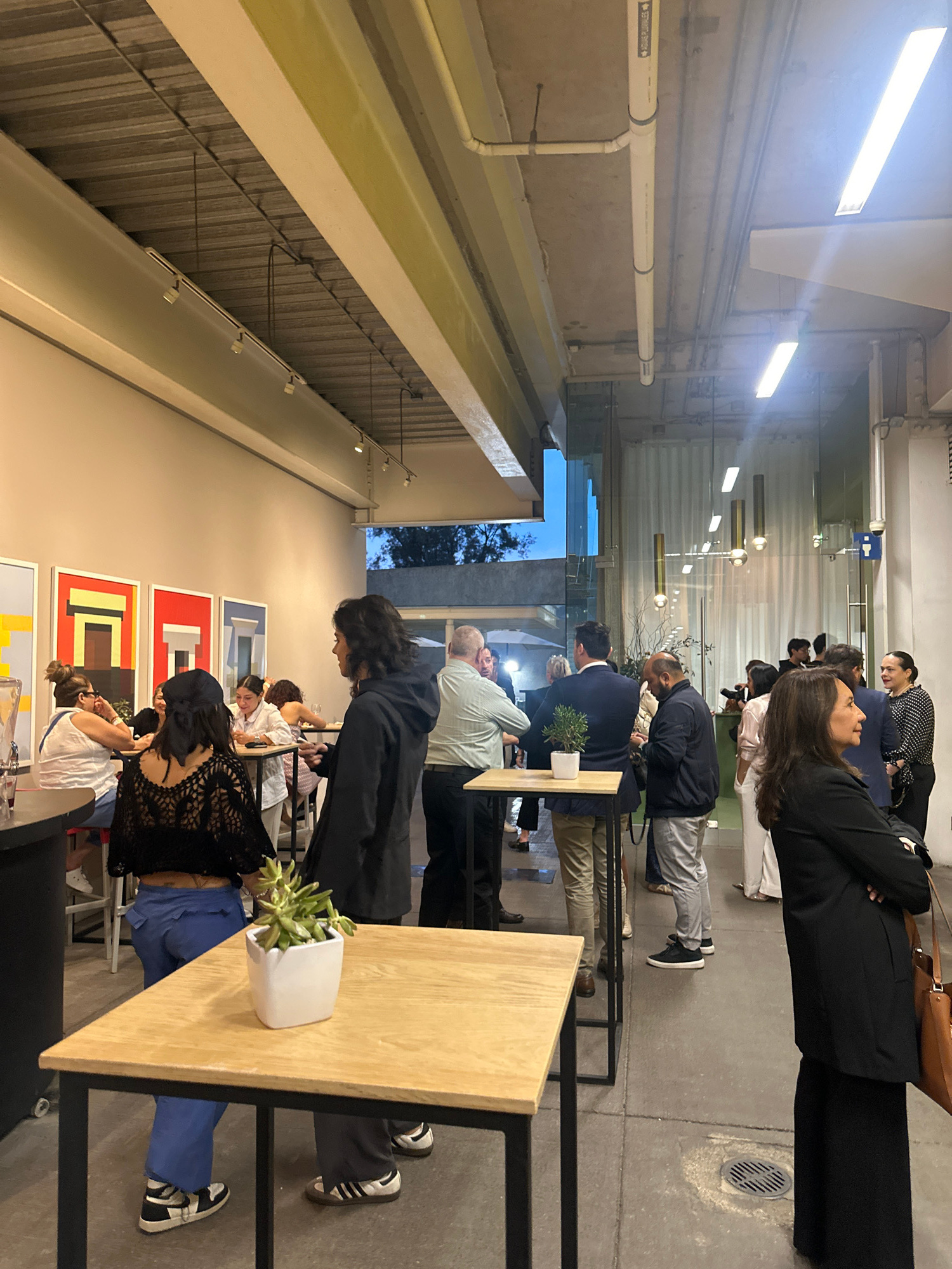 This image captures an indoor social gathering taking place in the evening. The setting appears to be a modern venue with an industrial aesthetic, featuring high ceilings, exposed piping, and concrete…read more