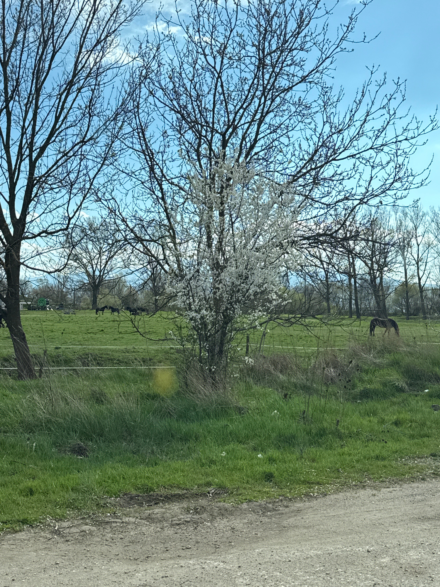 The scene depicts a rural or semi-rural landscape. A dirt path or road runs along the right edge. To the left of the path is a green field. Trees are interspersed throughout the scene. Some of the tre…read more