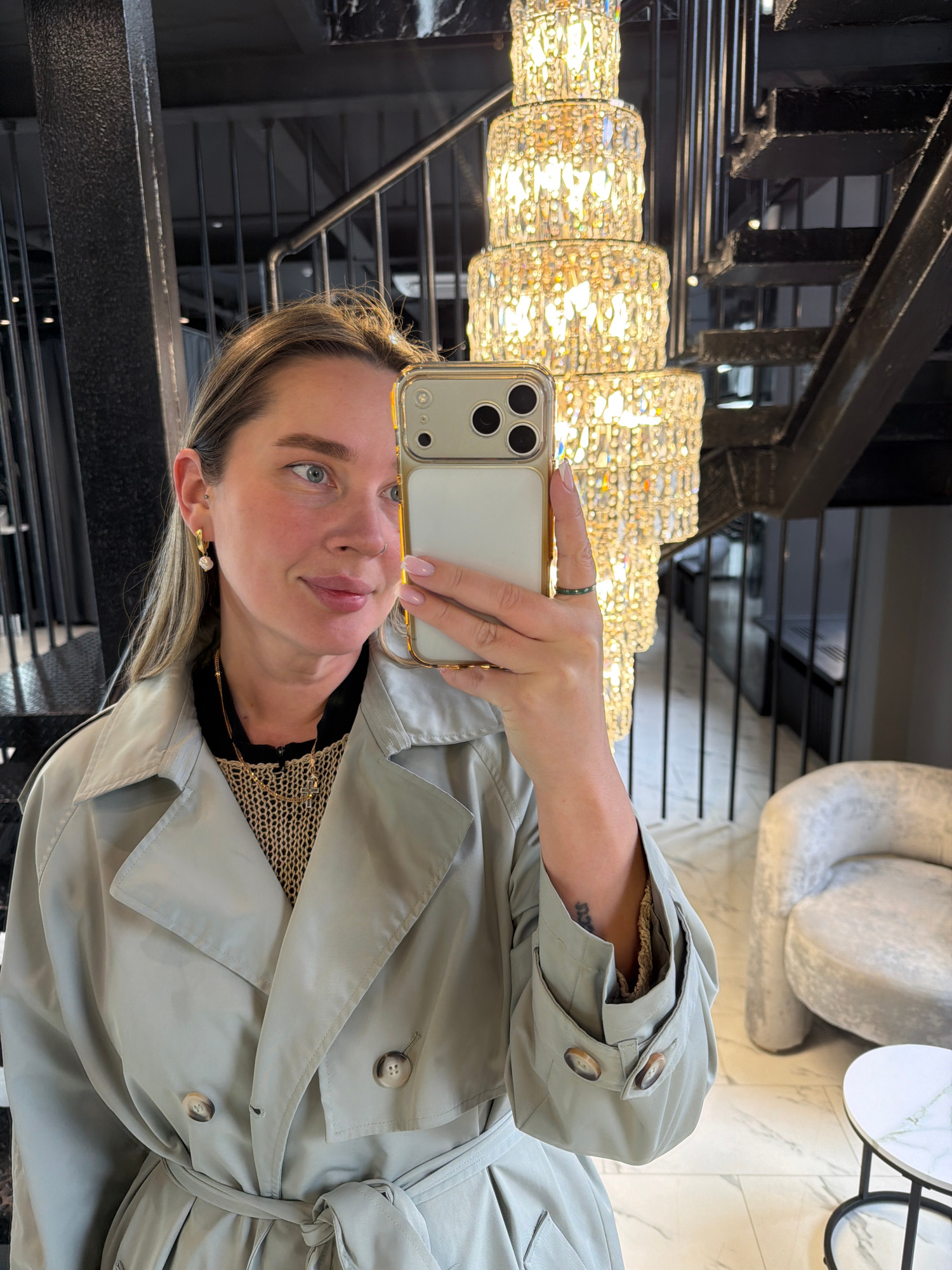 A woman is holding a smartphone, likely taking a selfie, in front of a large chandelier inside a building in Moscow, Russia. The woman is wearing a light beige trench coat and a gold chain around her…read more