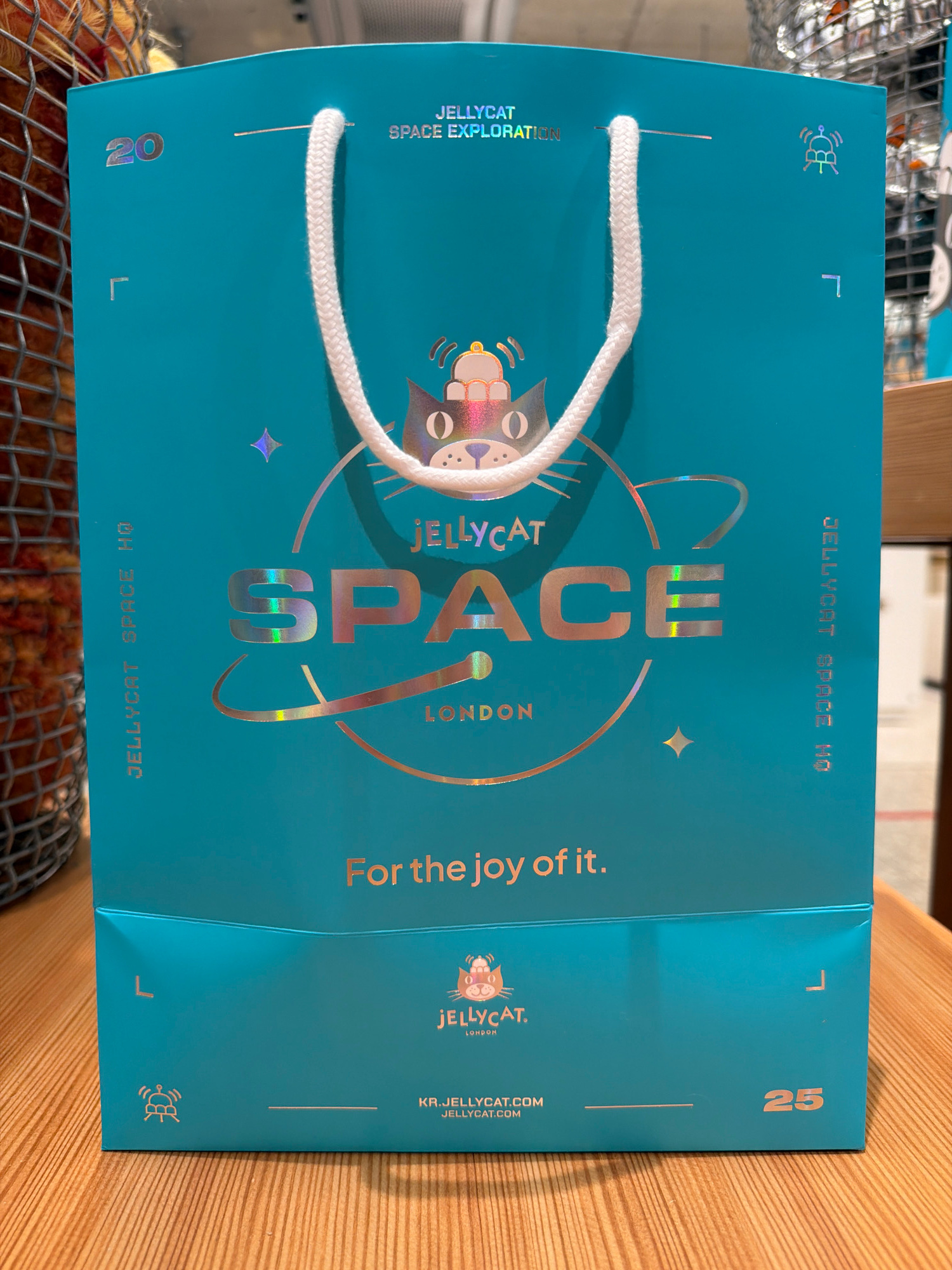 The image displays a turquoise blue JELLYCAT gift bag lying horizontally on a light-colored wooden surface. A white woven rope handle stretches across the top of the bag. The front of the bag is adorβ¦read more