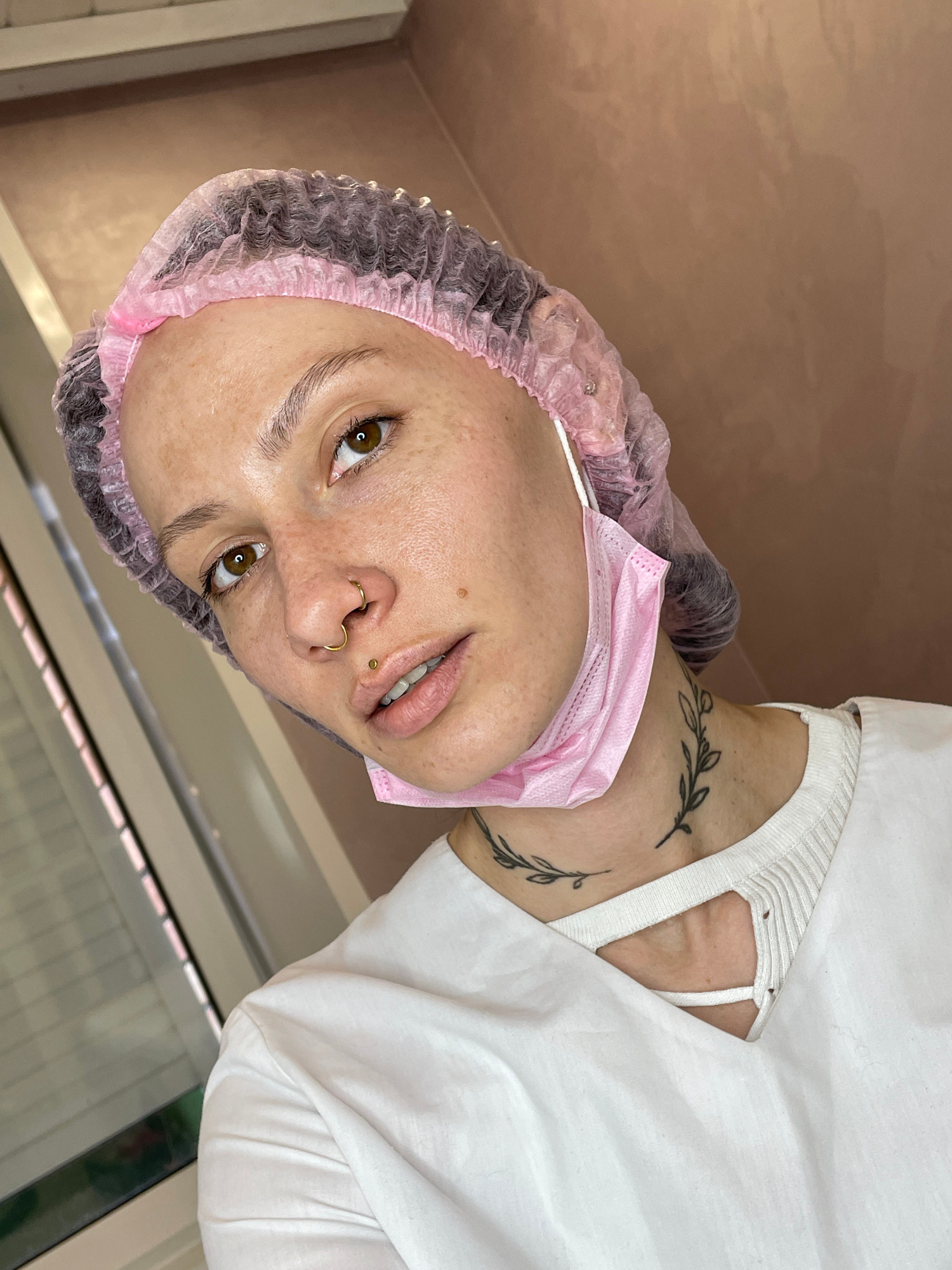A woman is lying on her back, wearing a pink surgical mask, a hairnet, and a white garment. She has tattoos on her neck and piercings in her nose and upper lip. The background includes a pinkish-tan w…read more