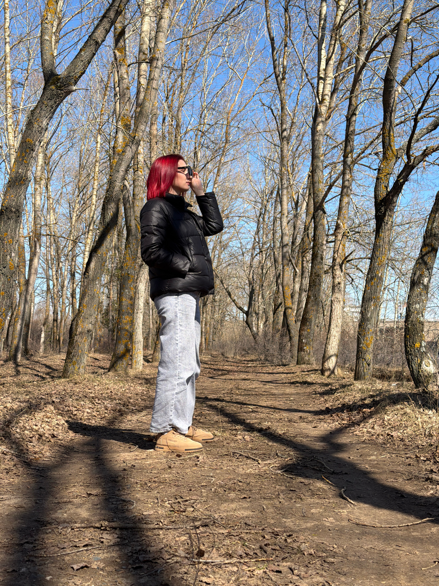 A woman with dark glasses and burgundy hair, wearing a black puffer jacket and grey jeans, stands on a path in a park in Chaikovsky, Russia. The path is lined with trees with bare branches, creating a…read more
