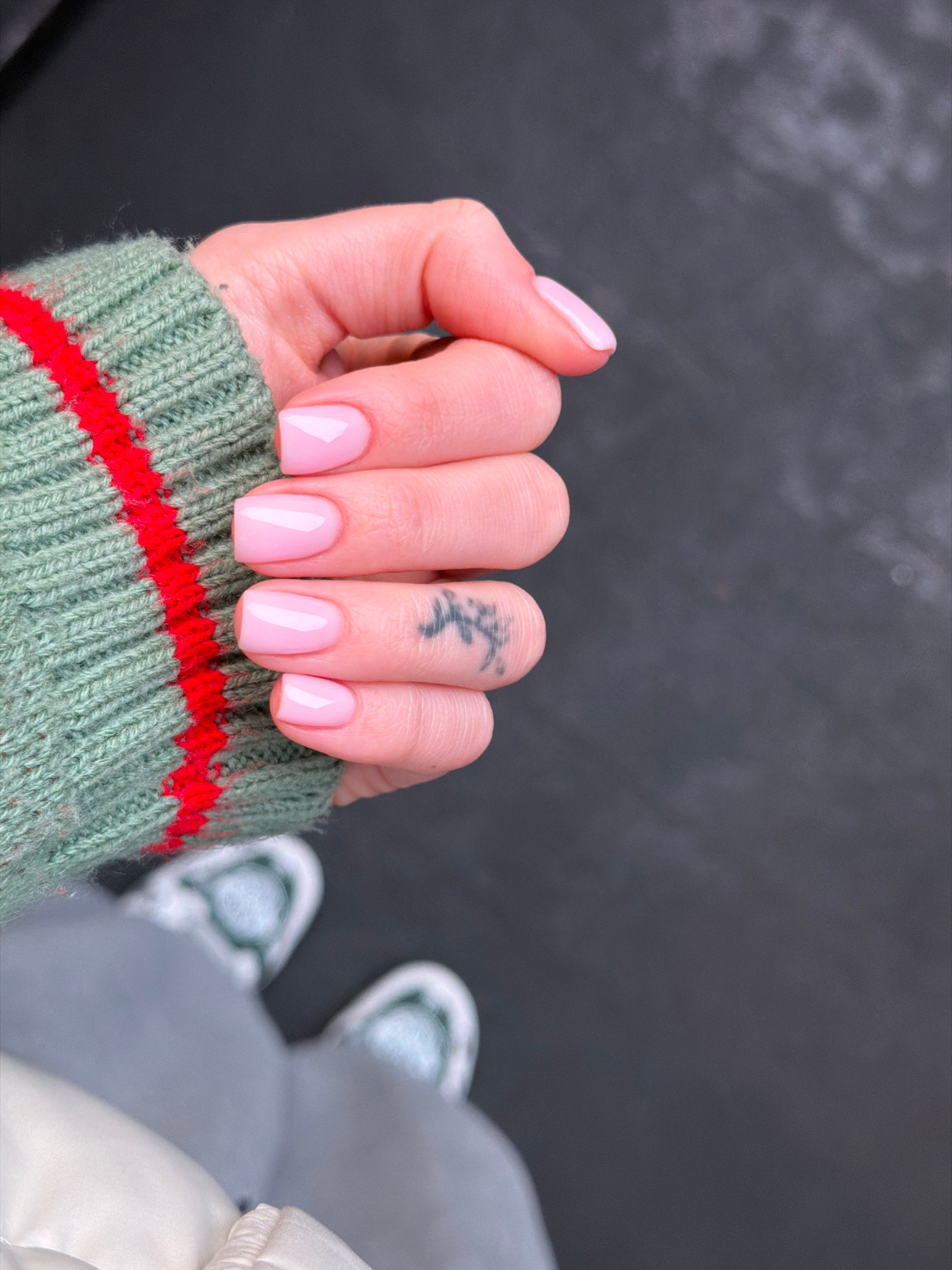 A close-up, eye-level shot captures a person's left hand, adorned with a fresh, glossy light pink manicure, against a dark, textured background. The hand is gently curled, showcasing well-maintained s…read more