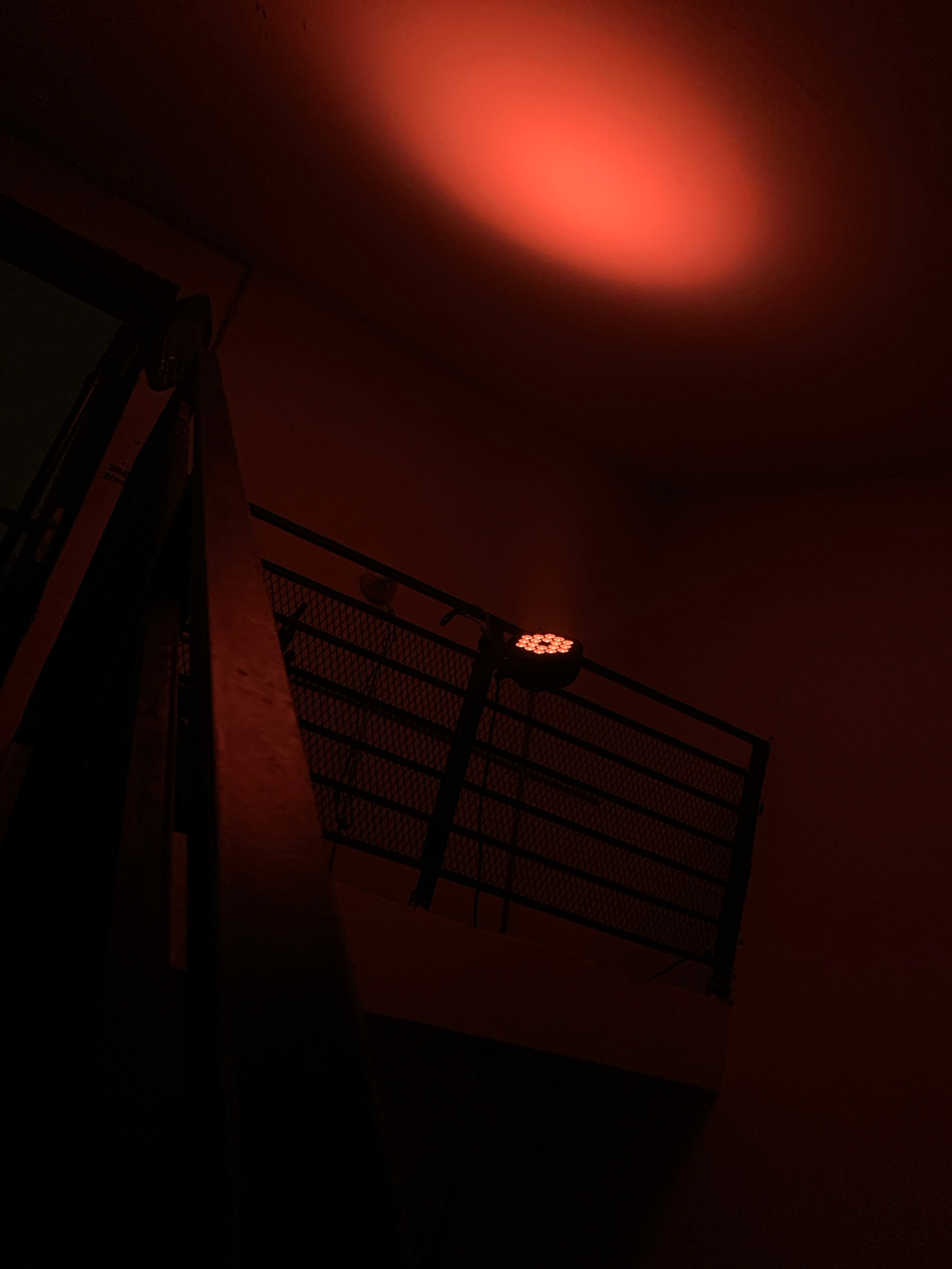 The image depicts a dimly lit interior space, likely in Tel-Aviv, Israel, given the prompt's instruction. A wall with a diffused red light source on the left illuminates the scene. A metal grate struc…read more