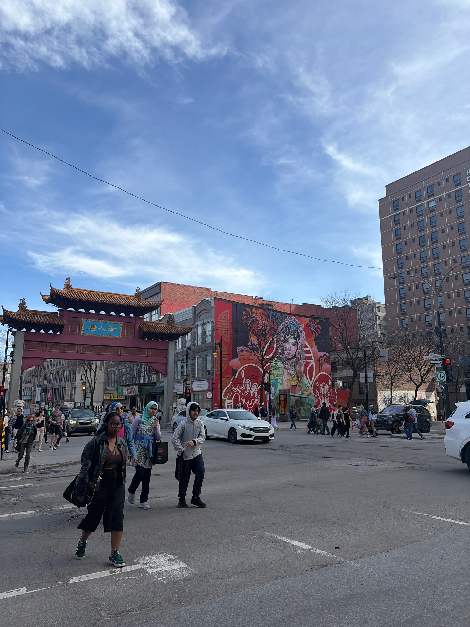 The image shows a street scene in Montreal's Chinatown. In the foreground, several people are walking across a crosswalk, while others are on the sidewalks. The Chinatown gate is visible on the left s…read more