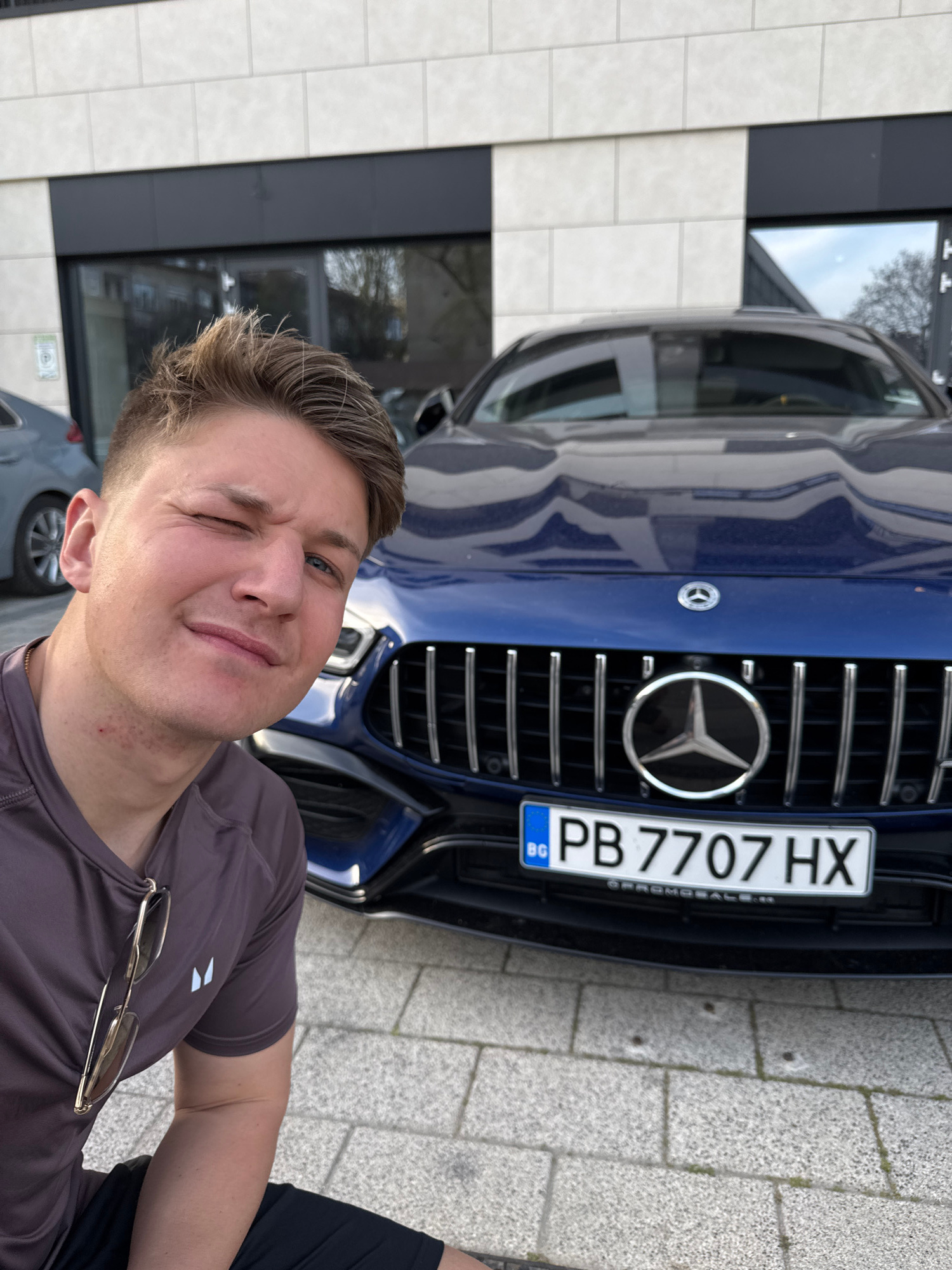 A man with light hair and a purple t-shirt is winking at the camera. He is standing in front of a blue Mercedes-Benz car. The car's license plate reads "PB 7707 HX" and has a Bulgarian flag. The backg…read more
