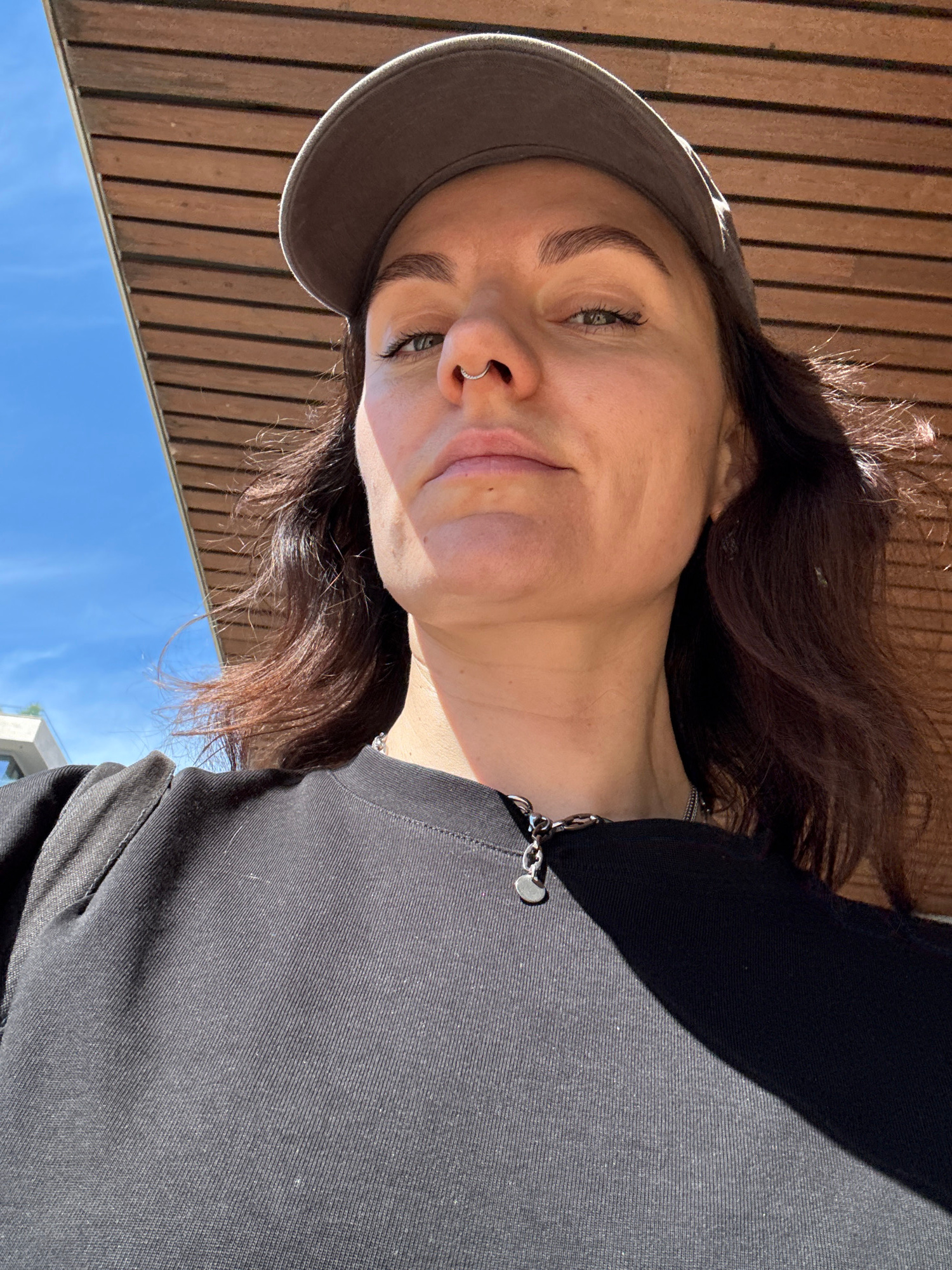 A woman with dark hair and fair skin poses for a selfie outdoors. She wears a gray cap and a dark gray shirt with a black jacket. A silver chain necklace is visible. She has a nose ring in her left no…read more