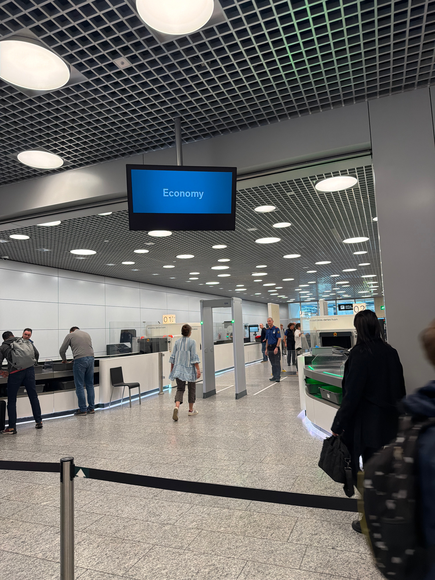 This media file depicts a brightly lit, modern airport environment, likely a security or check-in area, in Kloten, Switzerland. The scene is dominated by a distinctive ceiling featuring a white grid pā¦read more