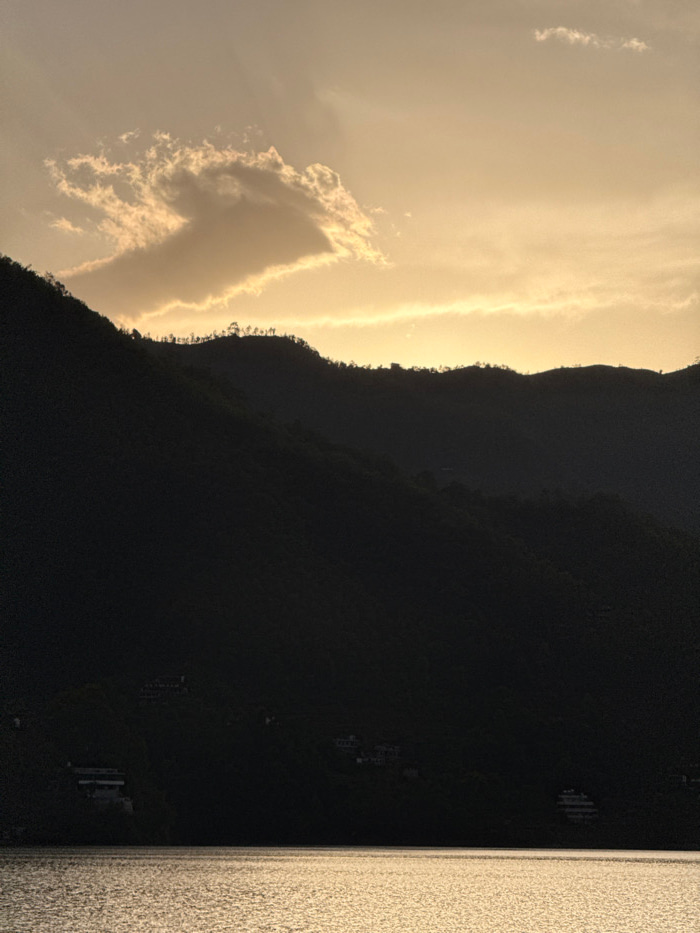The image displays a landscape scene at either sunrise or sunset, centered on Phewa Lake in Pokhara, Nepal. The upper half of the frame features a golden-orange sky with scattered clouds; a prominent,…read more