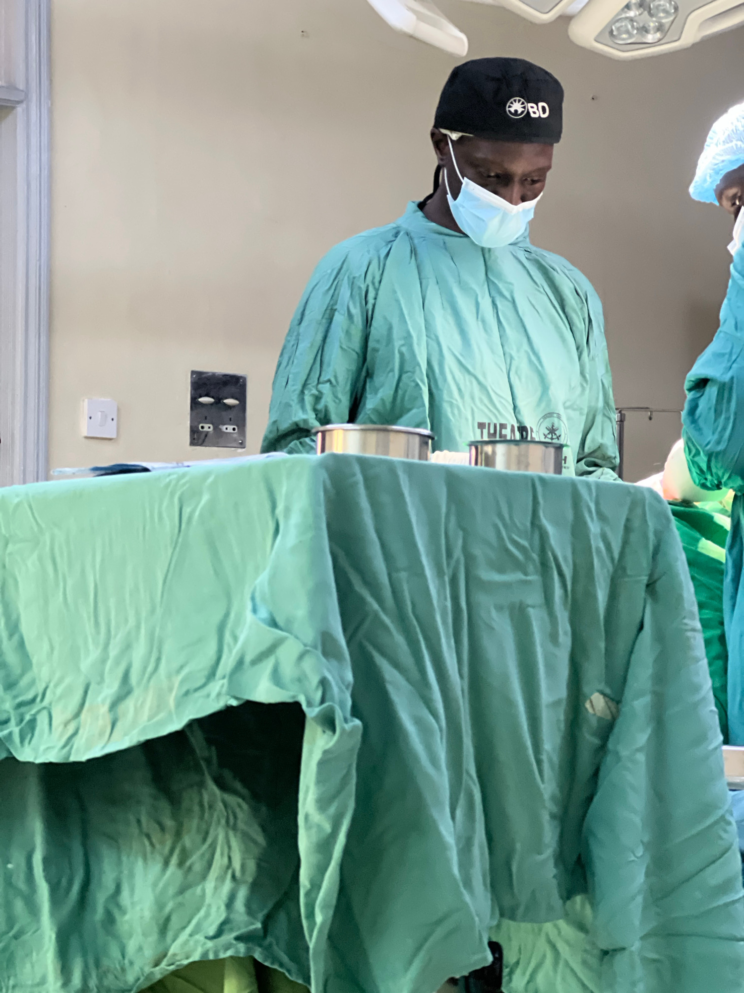 A male surgeon wearing surgical scrubs, a surgical cap with "BD" written on it, and a surgical mask is shown. He is standing in an operating room, in what could be a hospital setting, possibly in Nairβ¦read more
