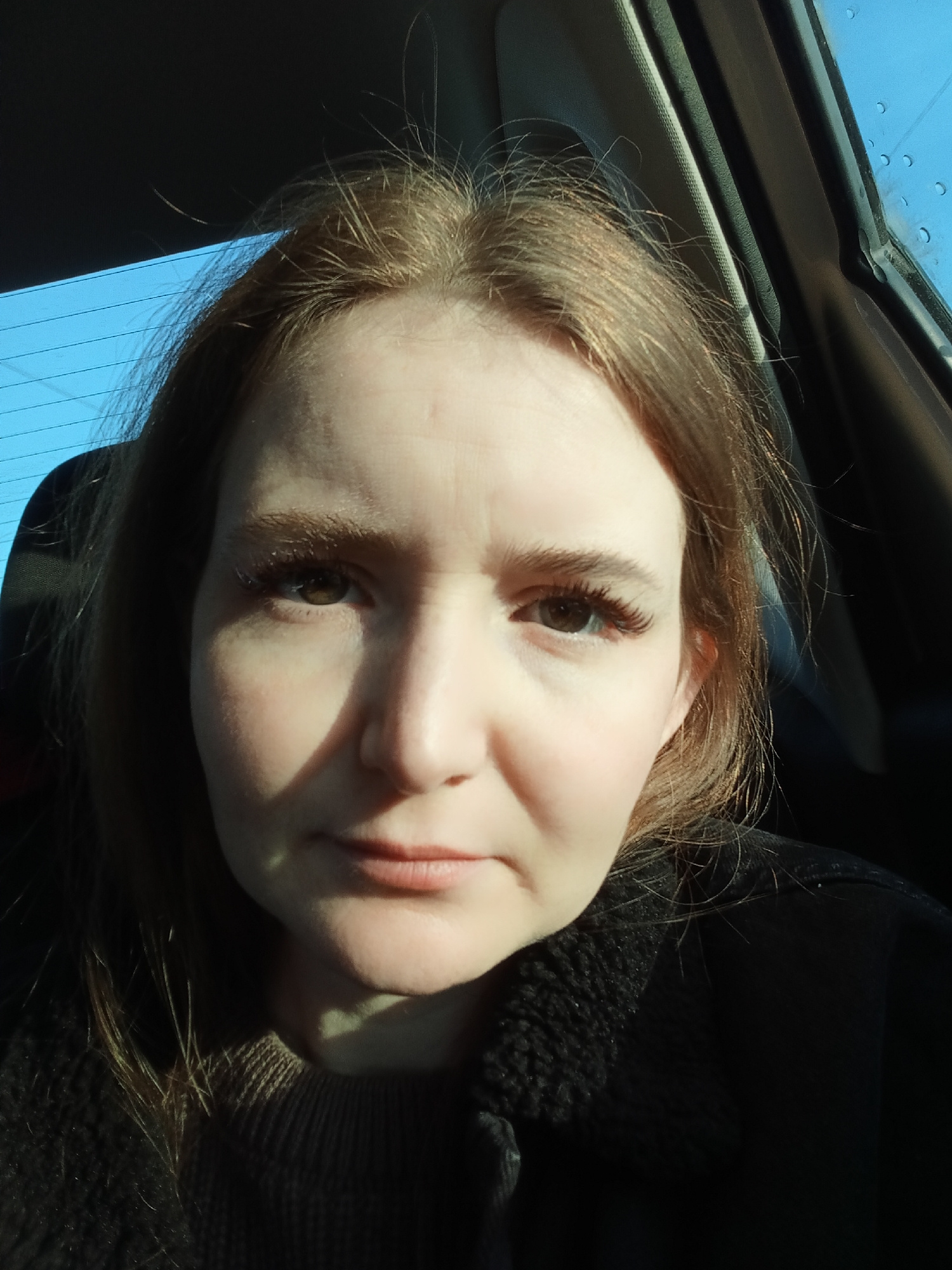 A medium close-up selfie photograph shows a fair-skinned woman with light brown hair, brown eyes, and false eyelashes. She is looking directly at the camera with a neutral expression. She is wearing a…read more