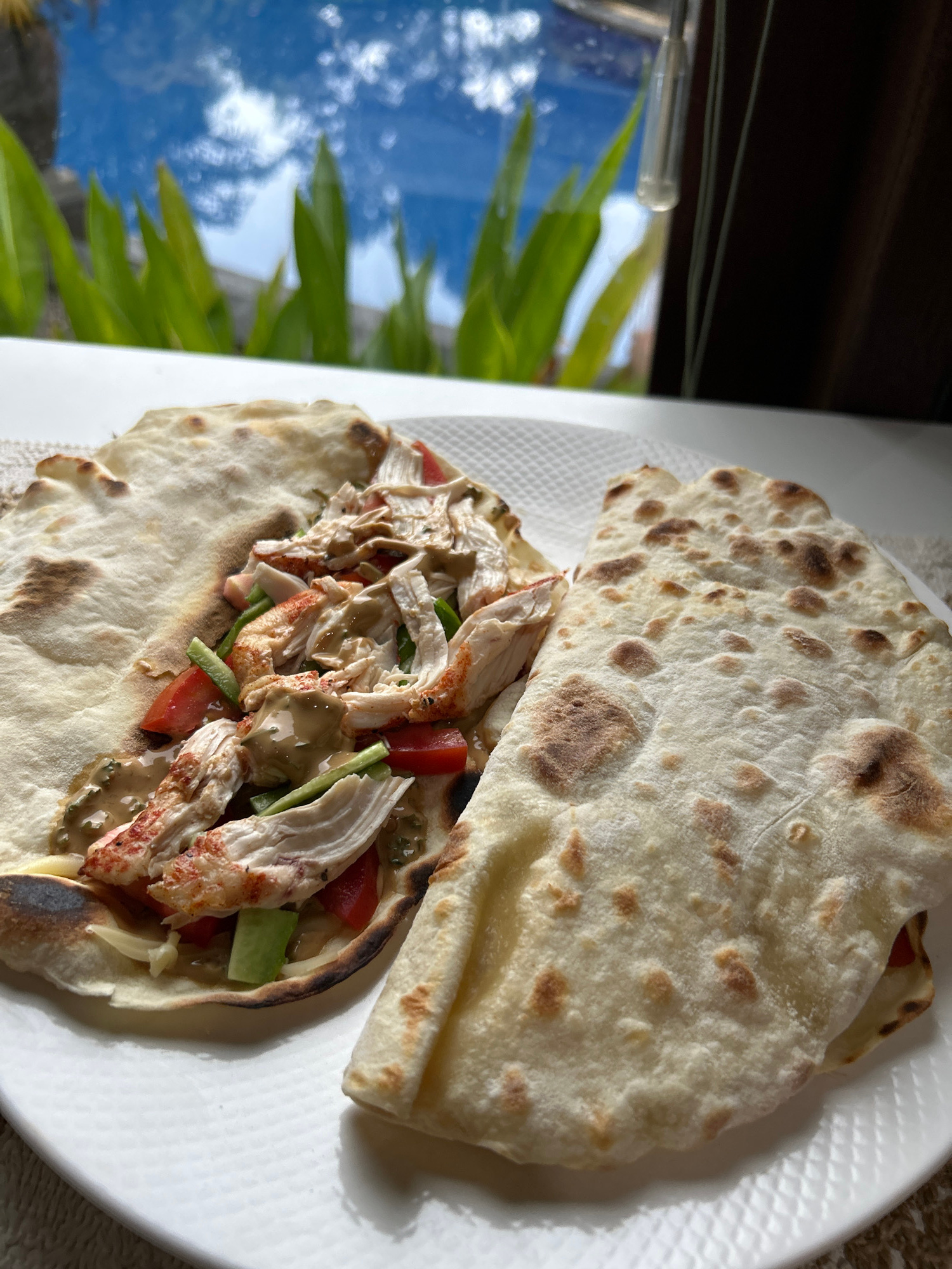 The image presents a close-up, elevated view of two filled flatbreads or wraps resting on a white, textured plate. The scene is indoors, with the plate positioned next to a window that reveals a blurr…read more