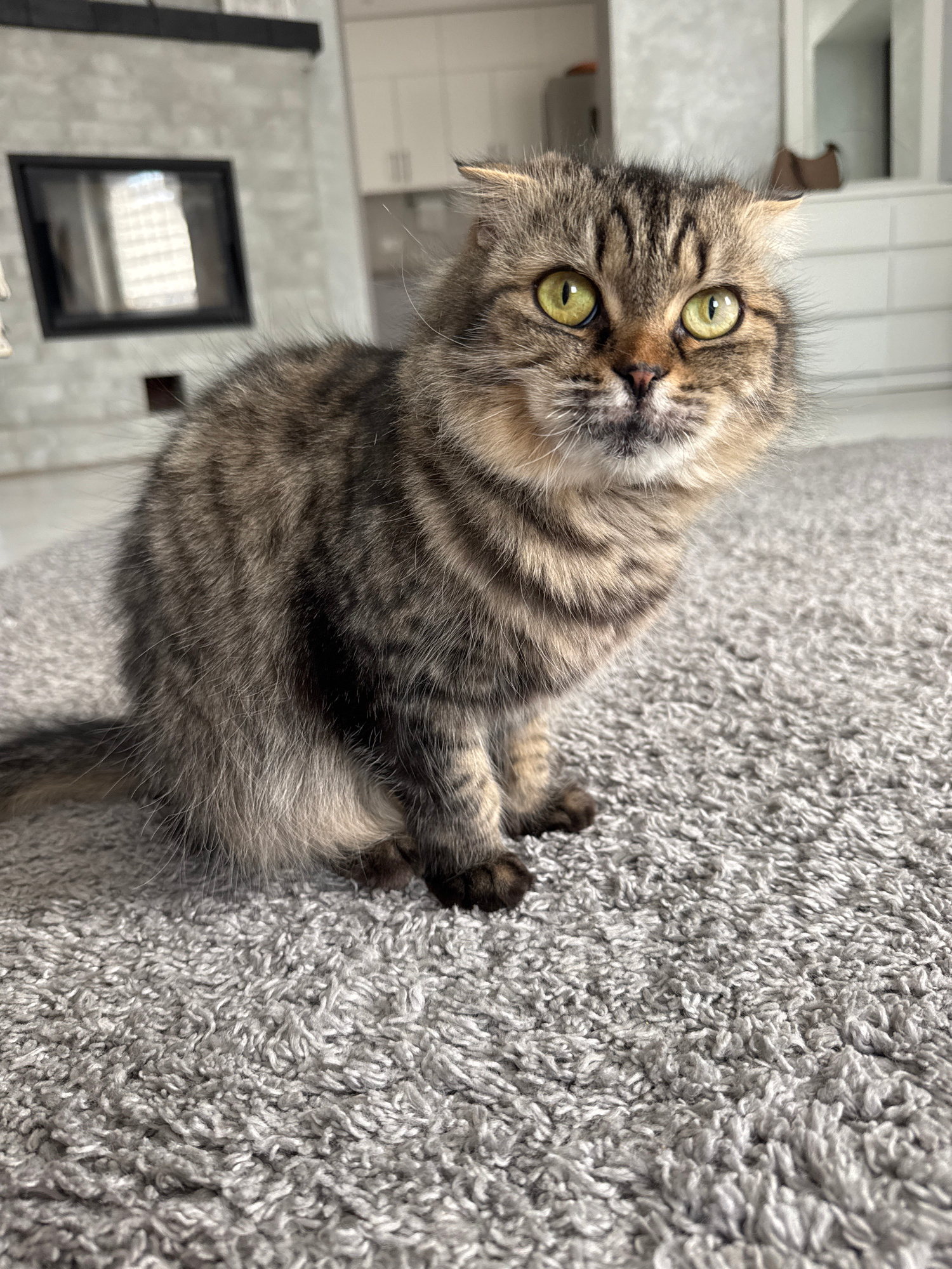 A tan and brown tabby cat with green eyes lies on a gray shag carpet. The cat is looking up at the camera with its head tilted. In the background, there is a white wall with a black fireplace. The loc…read more