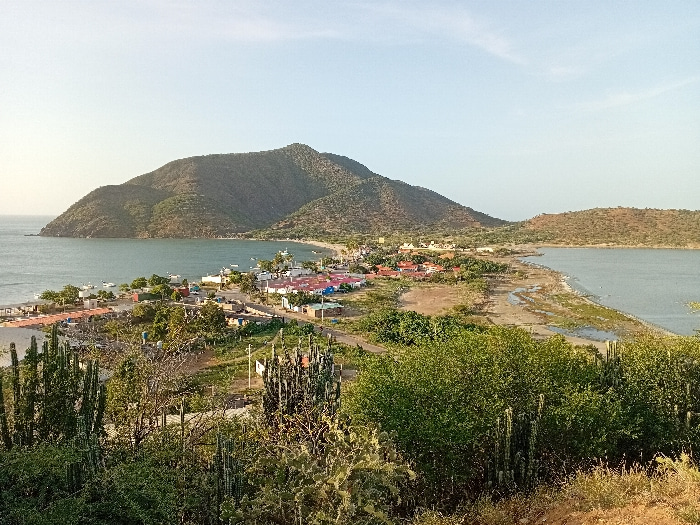 A landscape depicts a mountainous terrain with water stretching towards the horizon. A cluster of houses line the shore, situated between two bodies of water. Lush green vegetation, including cacti an…read more
