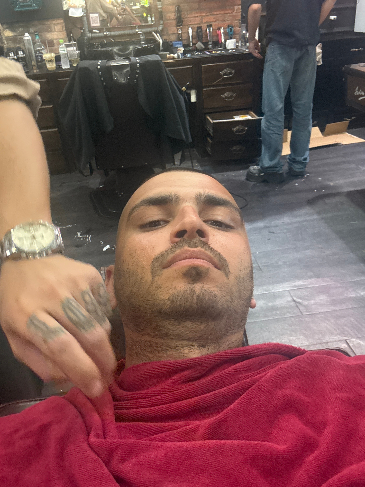 The image presents a man undergoing a grooming service, possibly a shave or facial treatment, in what appears to be a barbershop or salon setting. He is partially covered with a red towel. A person wi…read more