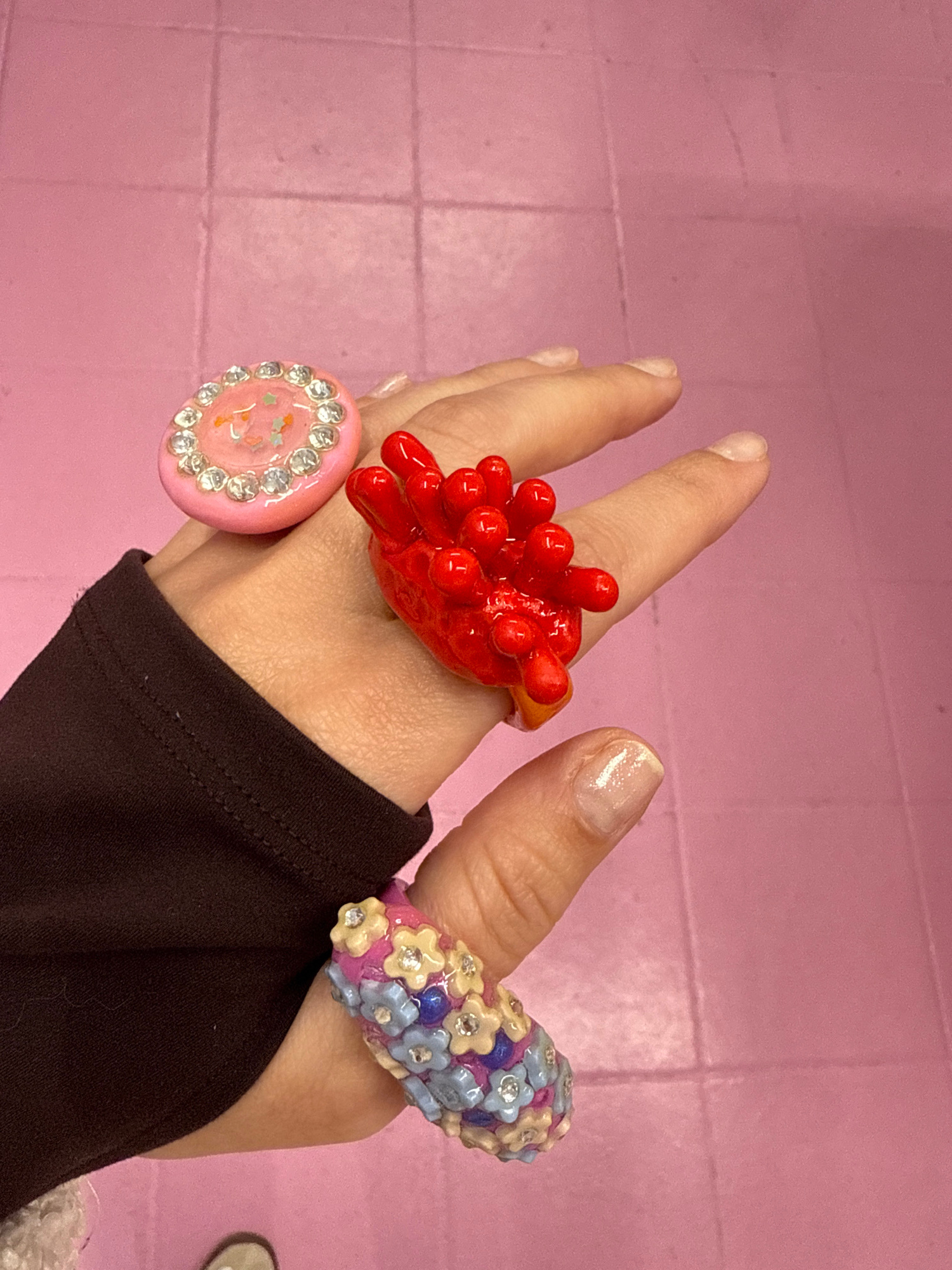 A right hand is adorned with three rings and positioned against a background of pink tile. The background is slightly blurred. The hand is light-skinned, with short nails. From left to right, the rinβ¦read more