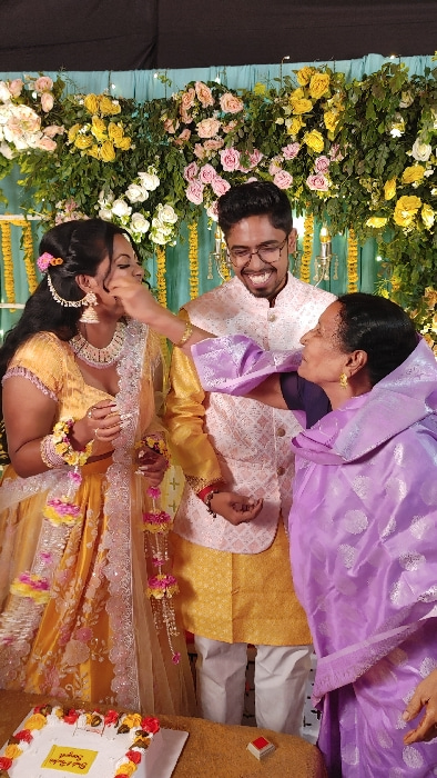 This image captures a heartfelt moment from a Sangeet ceremony, a pre-wedding celebration, taking place in Dhaka, Bangladesh. The scene features three individuals amidst a vibrant, festively decorated…read more