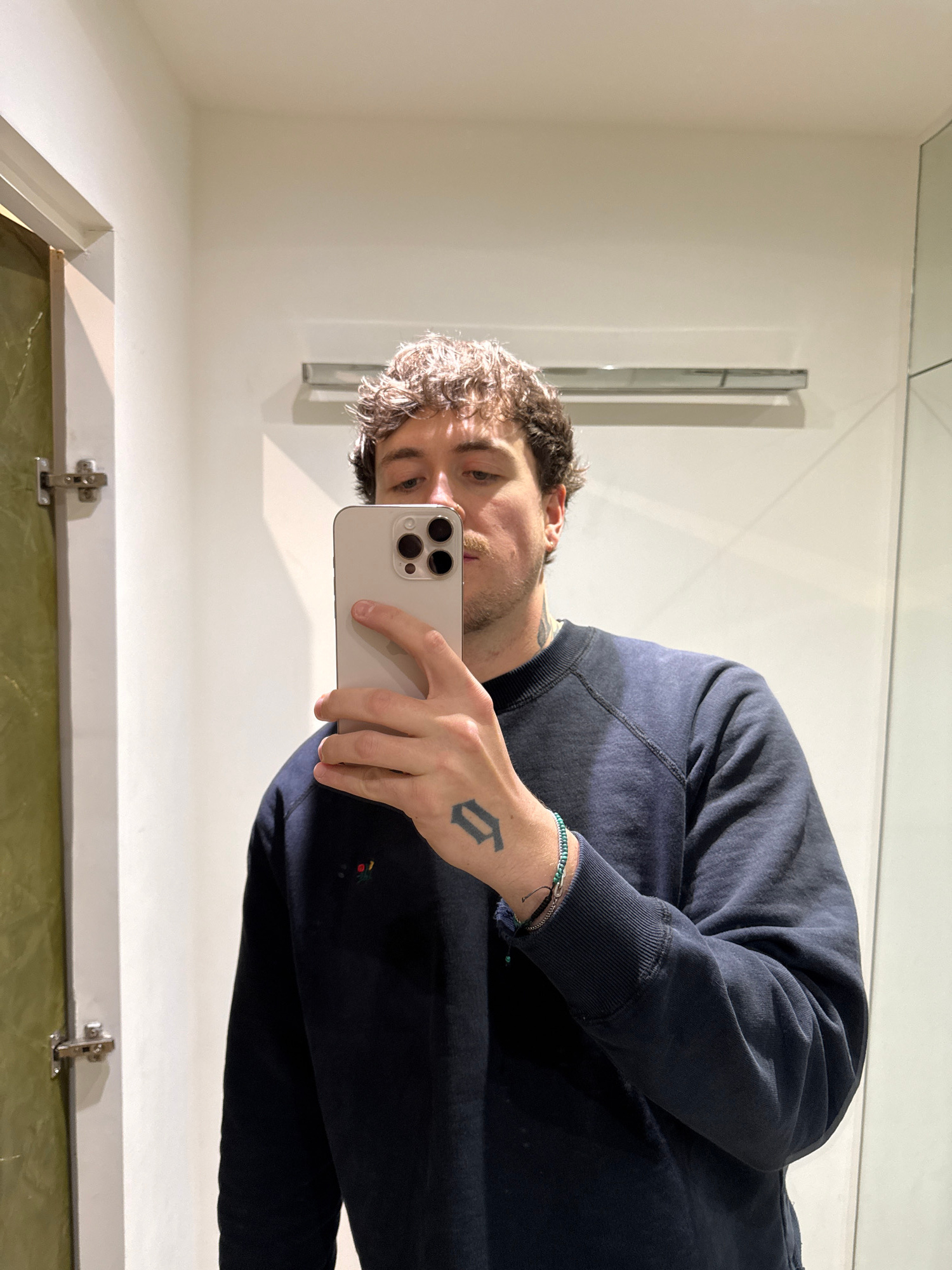 A Caucasian male is taking a selfie in a bathroom mirror. He is wearing a navy-blue sweatshirt and holding a white iPhone. The bathroom has white walls and a mirror. The lower part of the mirror refle…read more
