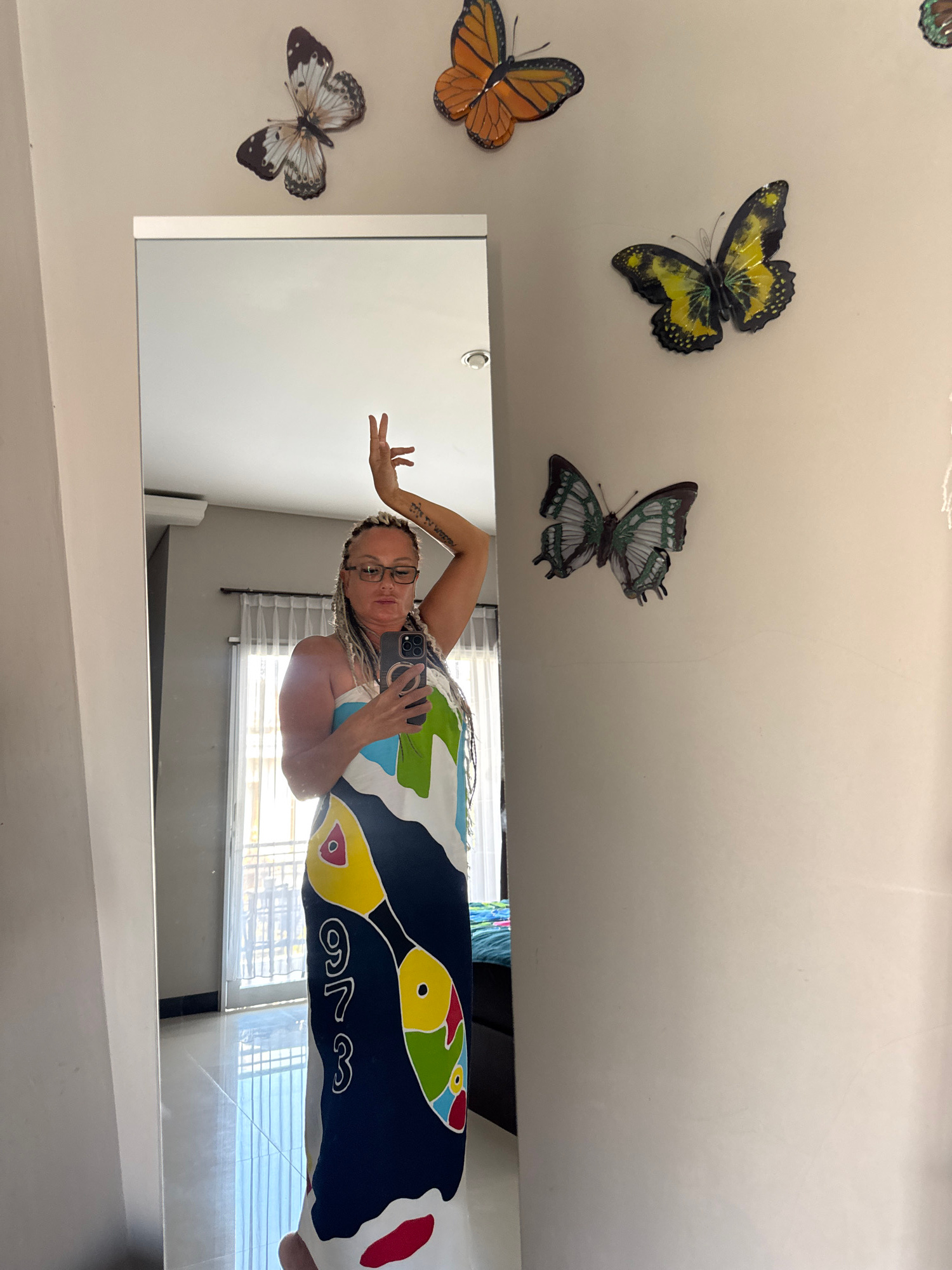 A woman with long, light-colored braids and glasses is taking a mirror selfie. She's wearing a dress with a toucan design in black, yellow, green, and red. Her left arm is raised above her head, hand…read more