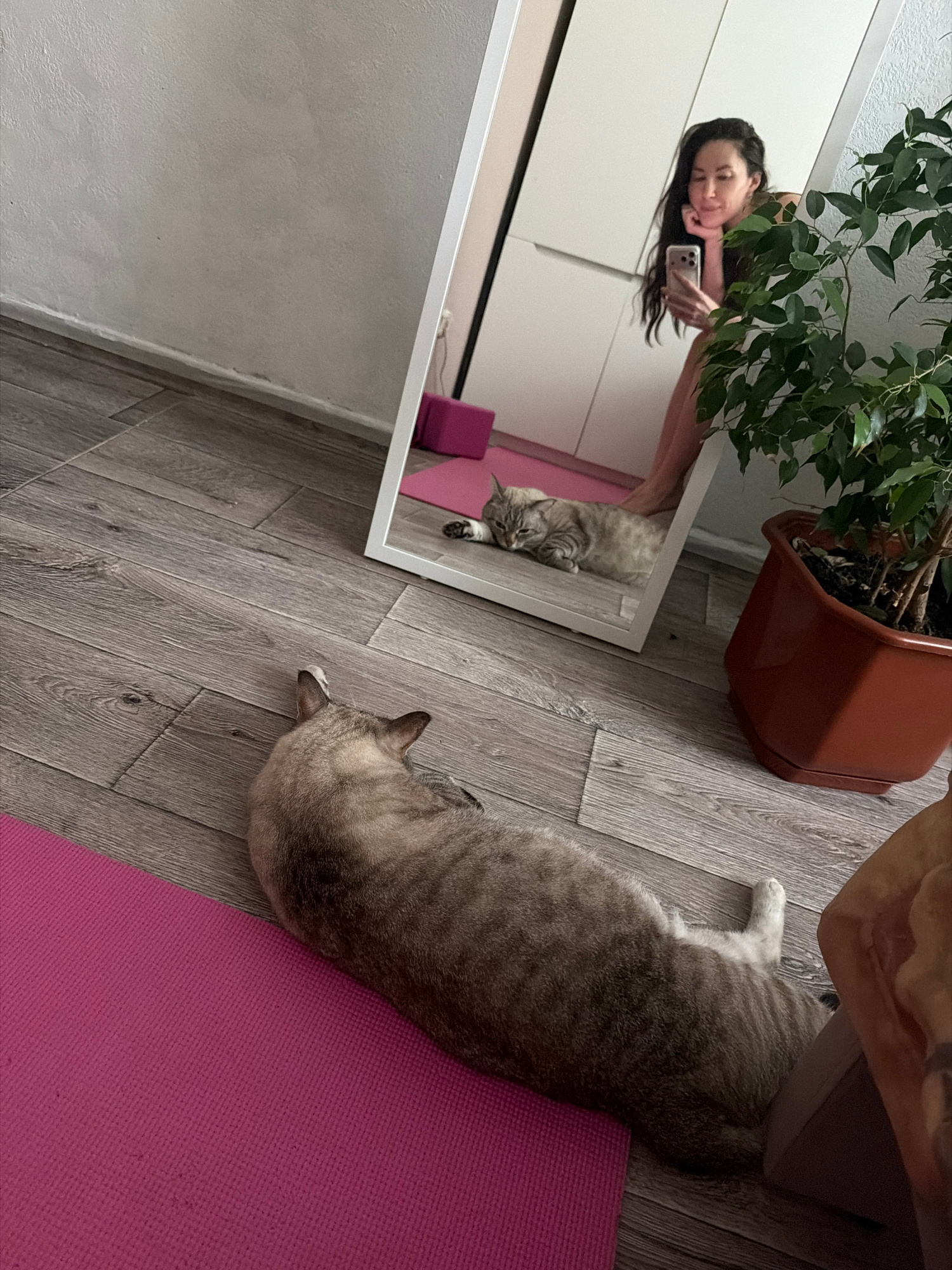 A woman takes a picture of herself in a mirror with a cell phone. The mirror is leaning against a white wardrobe and reflecting the woman, a plant, a yoga block and the cat. The actual cat is lying on…read more