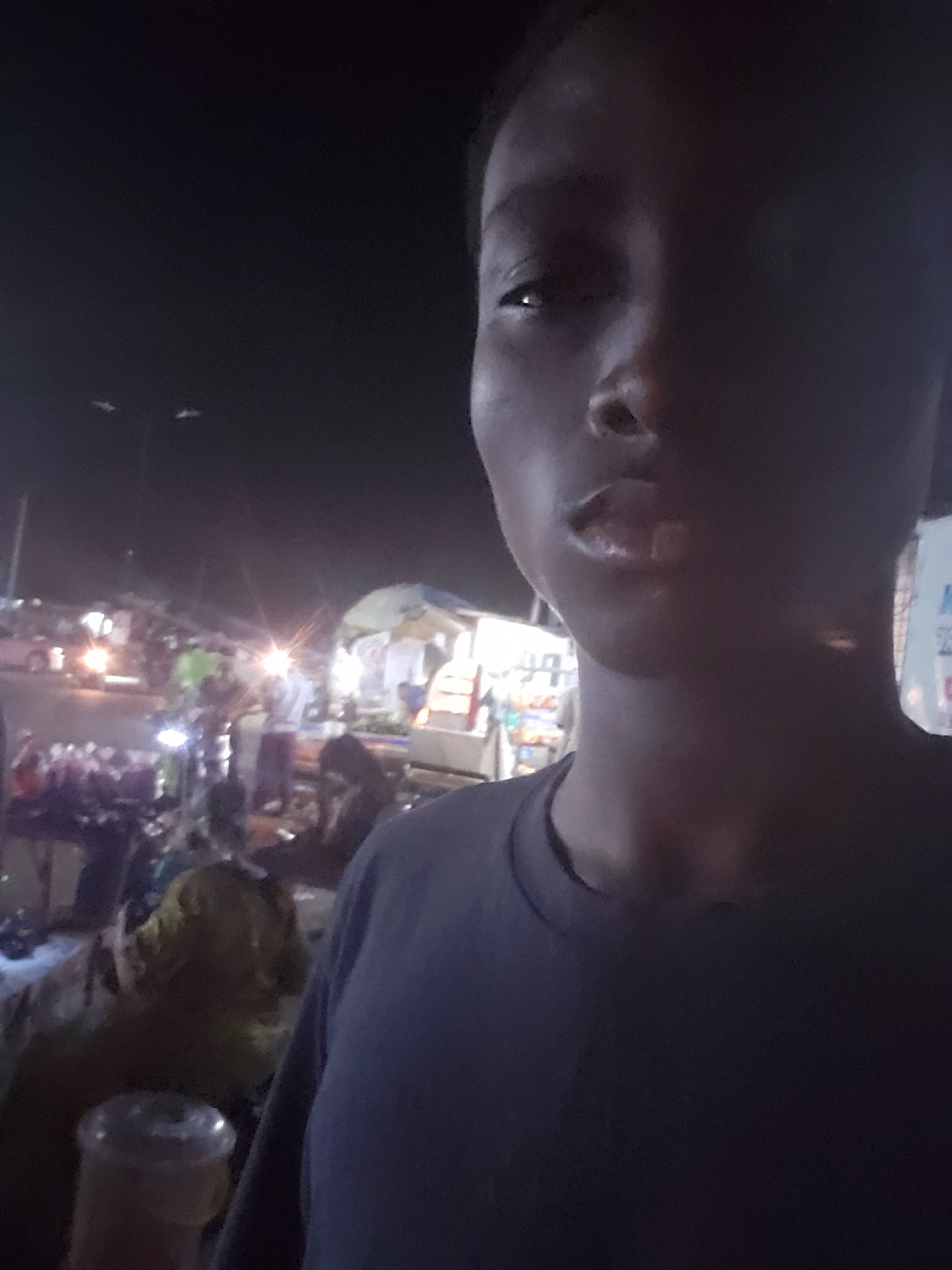 The media file captures a dark, nighttime scene, likely a street or market in Ibadan, Nigeria, from a first-person perspective. The primary subject is a person in the foreground, with their face parti…read more