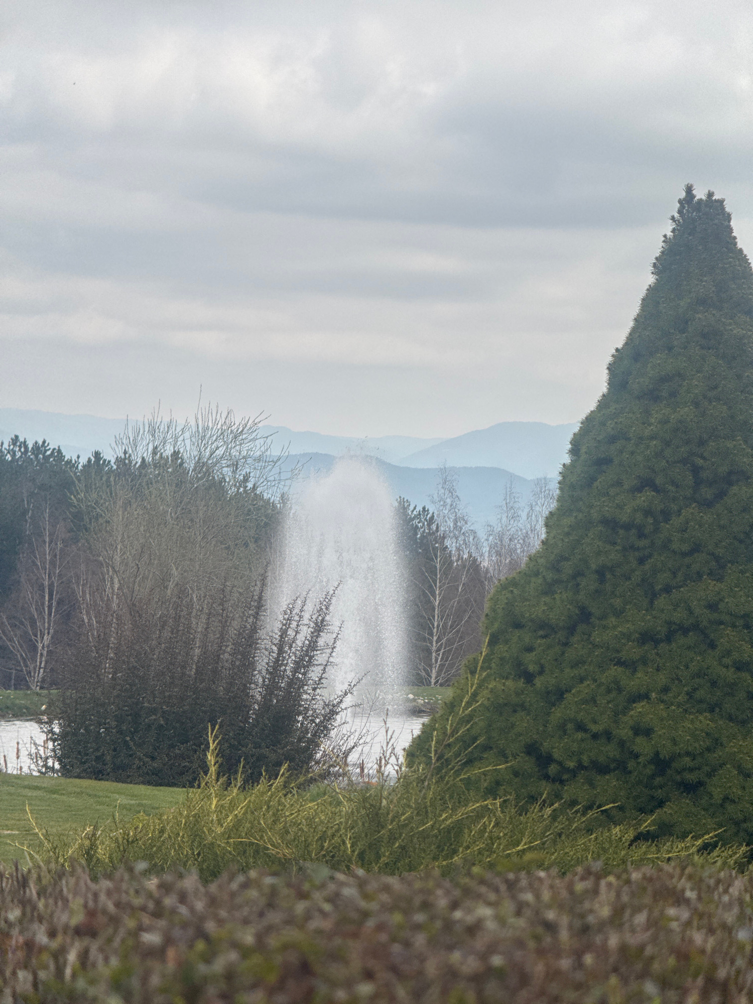 The image shows a landscape with a water fountain in the distance. The foreground features trees and greenery, partially obscuring the view of the fountain. In the background, mountains are visible un…read more