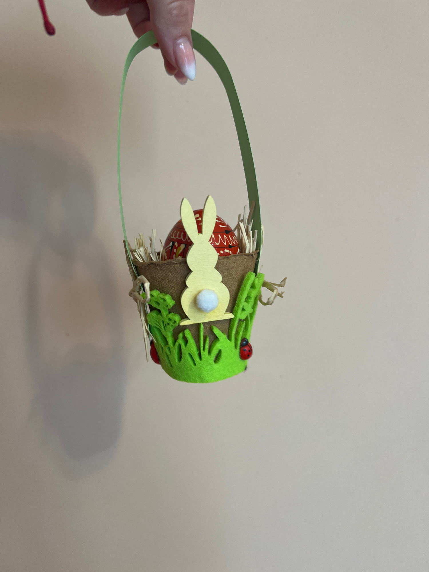 A hand holds a light-green, paper-like material to which an Easter egg decorated with a green frog, a yellow bunny, a ladybug, and straw is attached. The background is a plain, light-beige wall. The l…read more