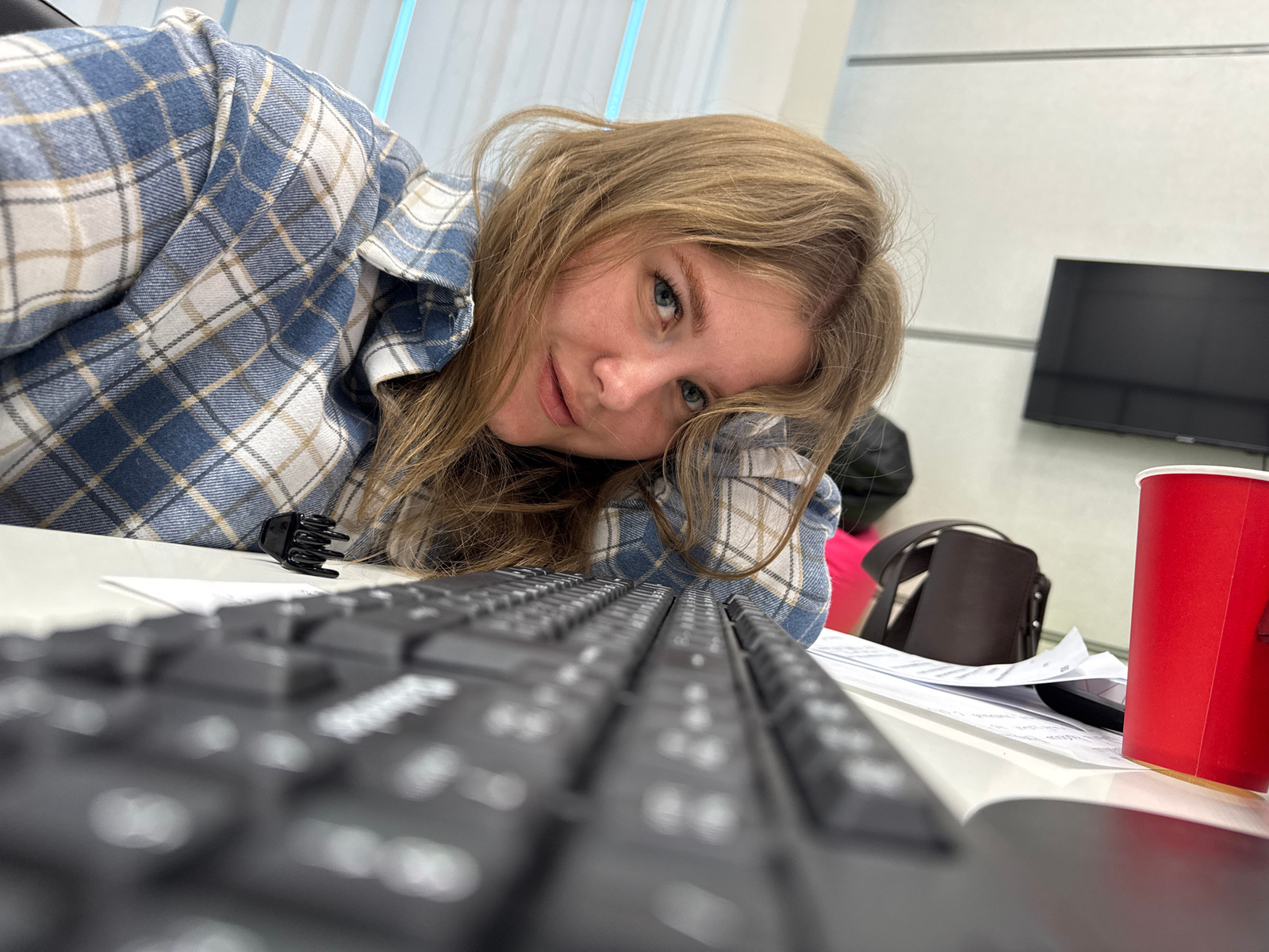 A young woman with blonde hair and blue eyes is lying on a desk next to a black computer keyboard. She is wearing a blue and white plaid shirt. To her left is a red paper cup, papers, and a black purs…read more