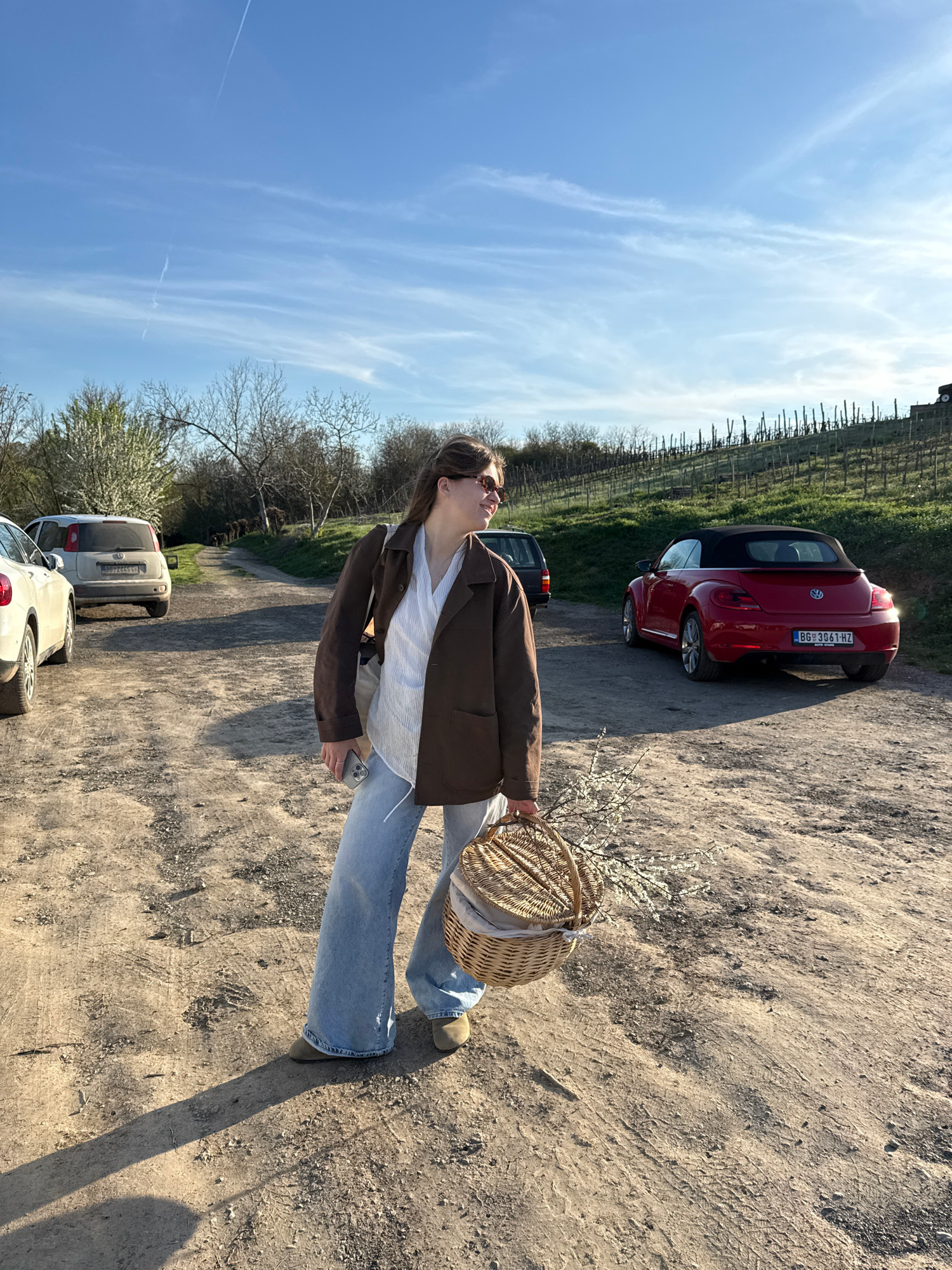A photograph depicts a woman standing on a dirt road in Irig Municipality, Serbia. She is facing forward, wearing a brown jacket, light blue jeans, and sunglasses. The woman holds a woven basket fille…read more