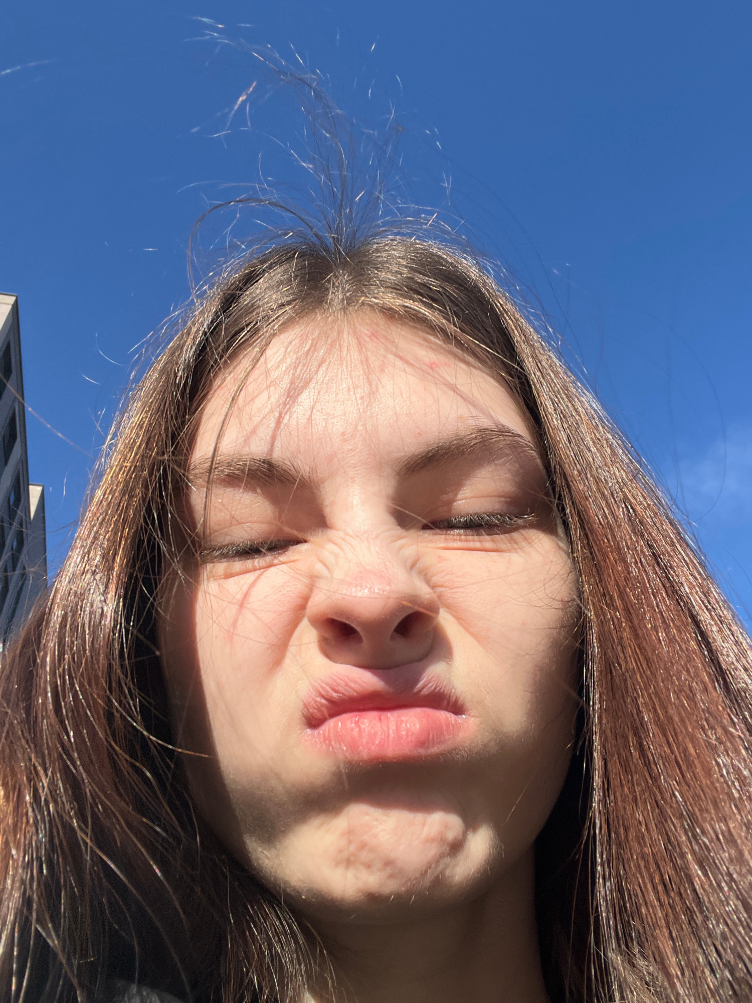 A close-up, low-angle portrait features a young woman with long, dark brown hair against a bright, clear blue sky. Her head is tilted, and her face is positioned to look upwards towards the camera or…read more