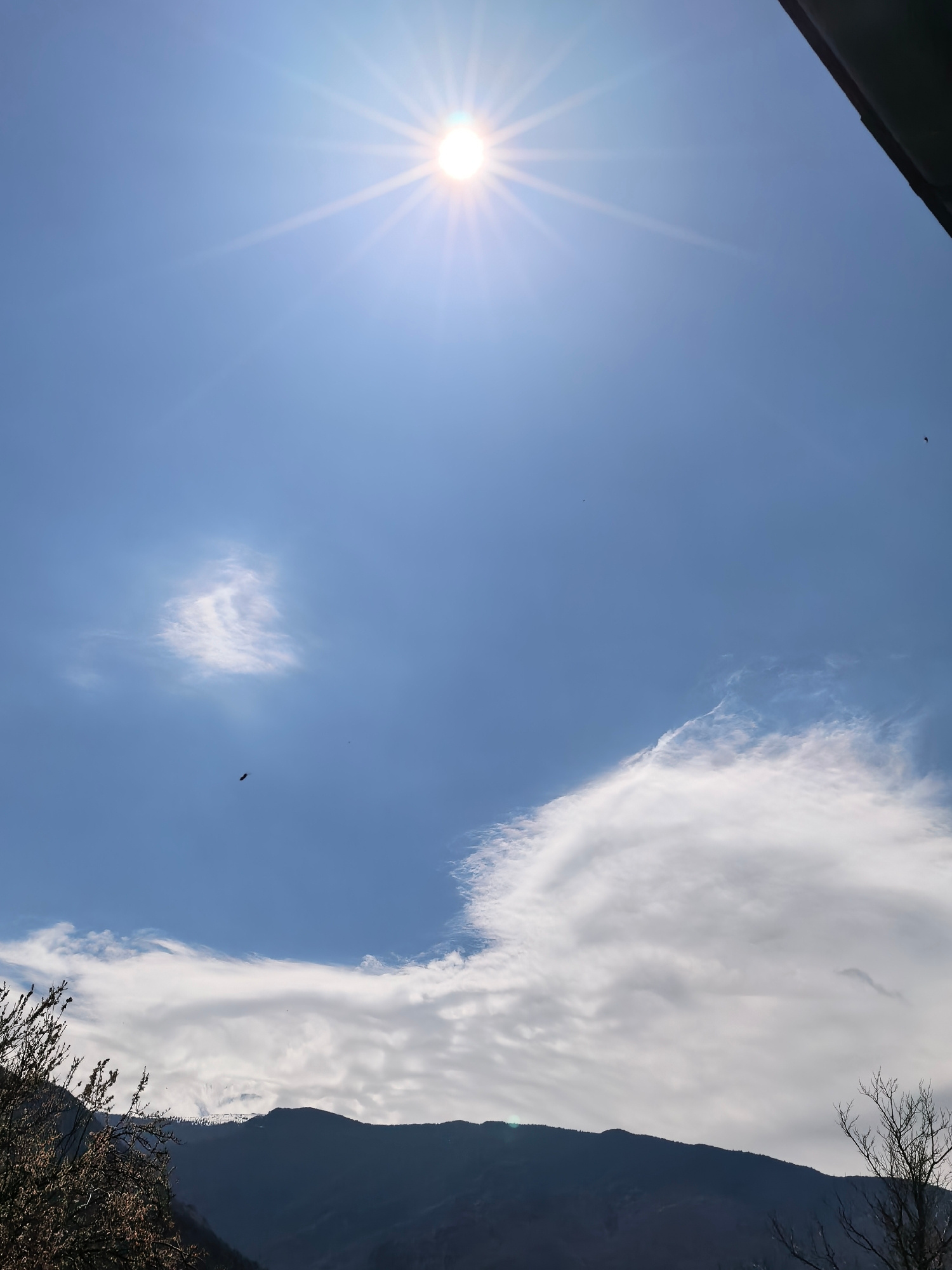 The image shows a daytime view of a sky with a bright sun at the top center, surrounded by sunbeams. The sky is predominantly blue with scattered clouds. In the lower portion of the image, there's a dā¦read more